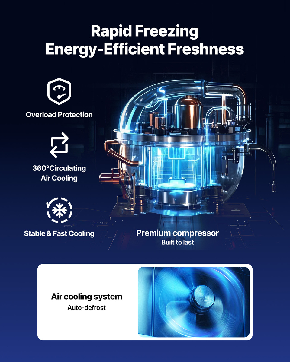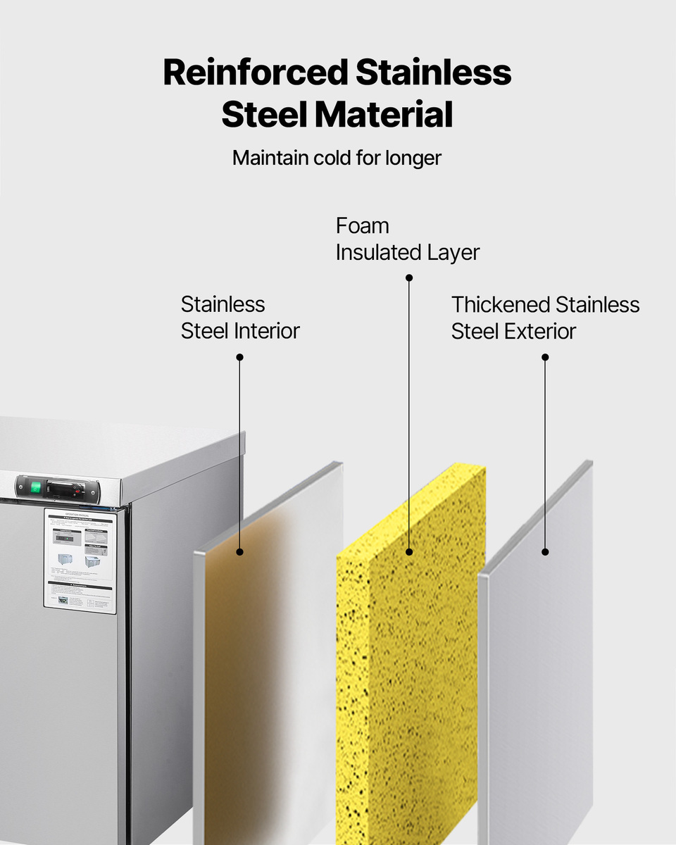 Quick Freezing: This food prep fridge features an Embraco compressor and finned copper tubes for even, reliable cooling and long-lasting freshness. Complies with UL, CSA tested standards and DOE efficiency regulations