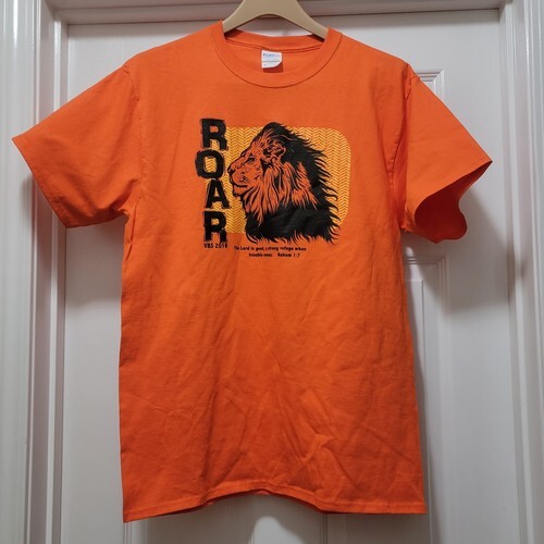 New Without Tags Port Company ROAR 2019 VBS Lion Head Christian Religious God Jesus Orange T-Shirt - Verse Nahum 1:7 - Men's Size Medium. 40" chest, 29" length. 100% cotton.