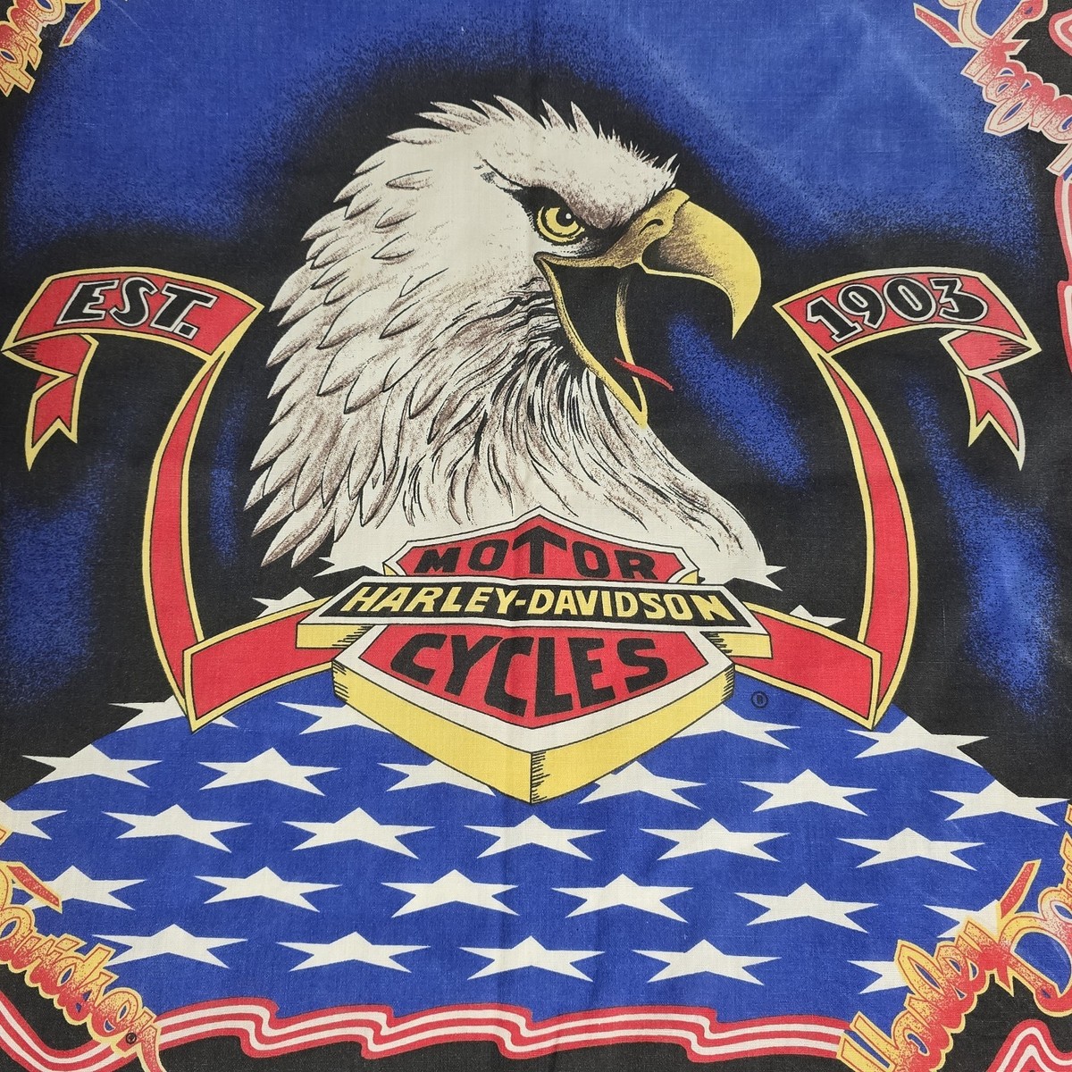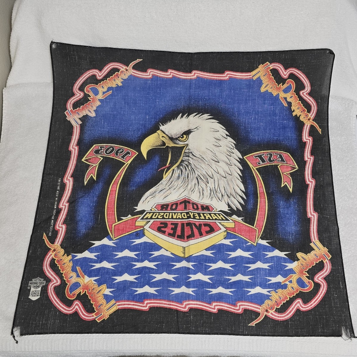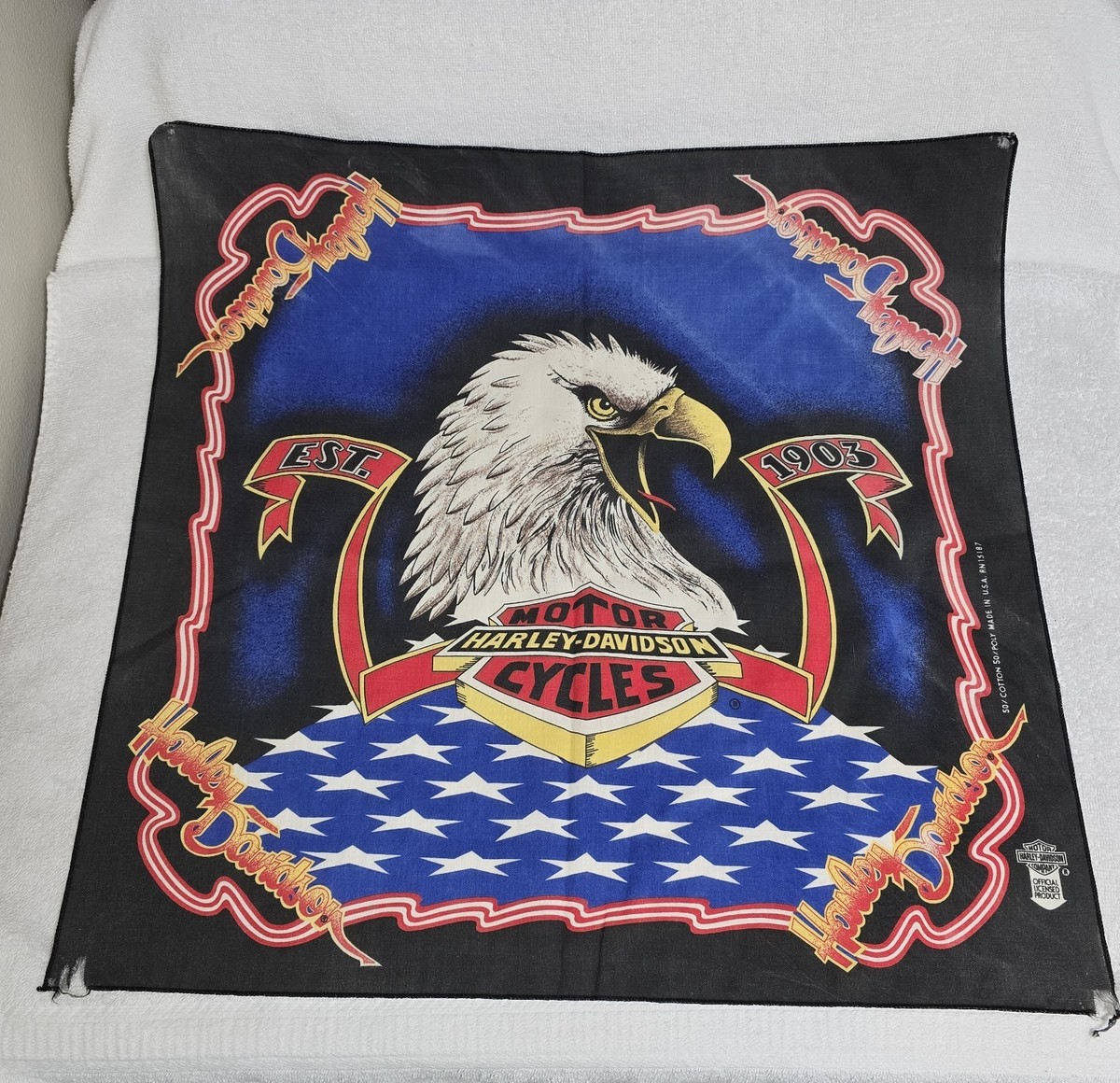 Vintage 1980s Harley Davidson Handkerchief Bandana Eagle Flag Stars Stripes - Made in USA.