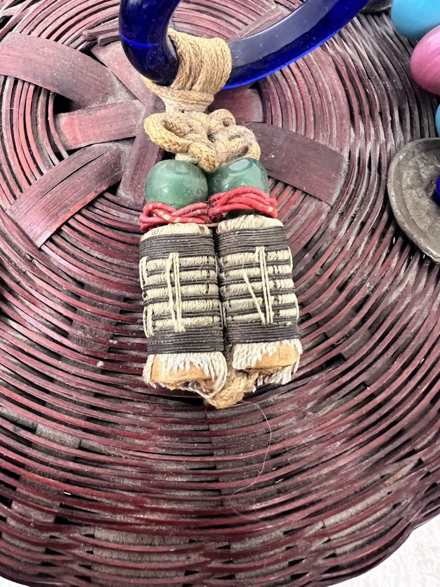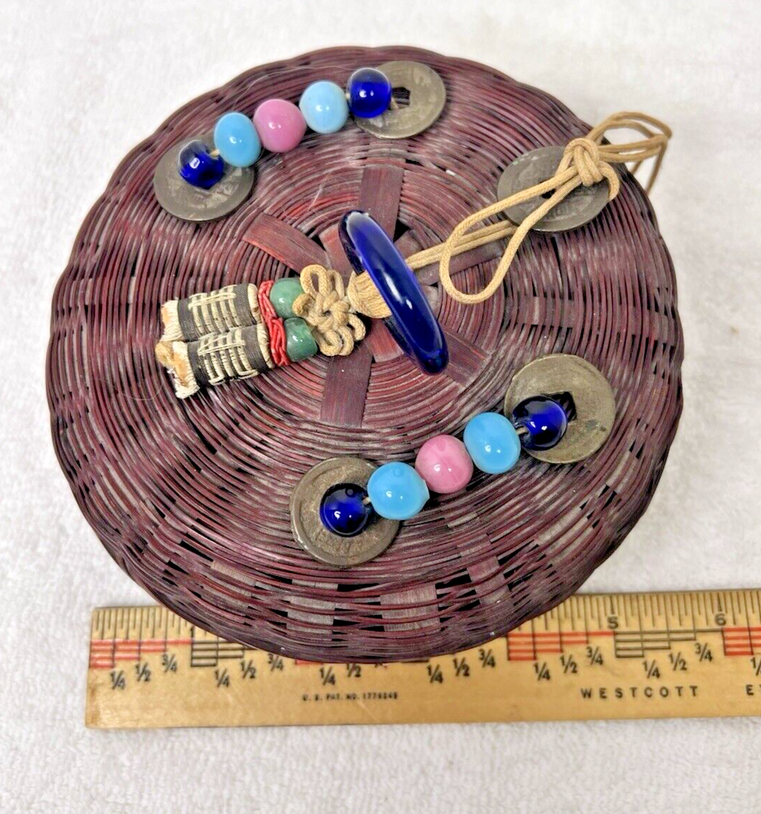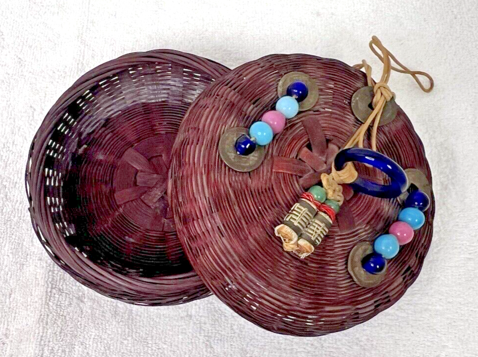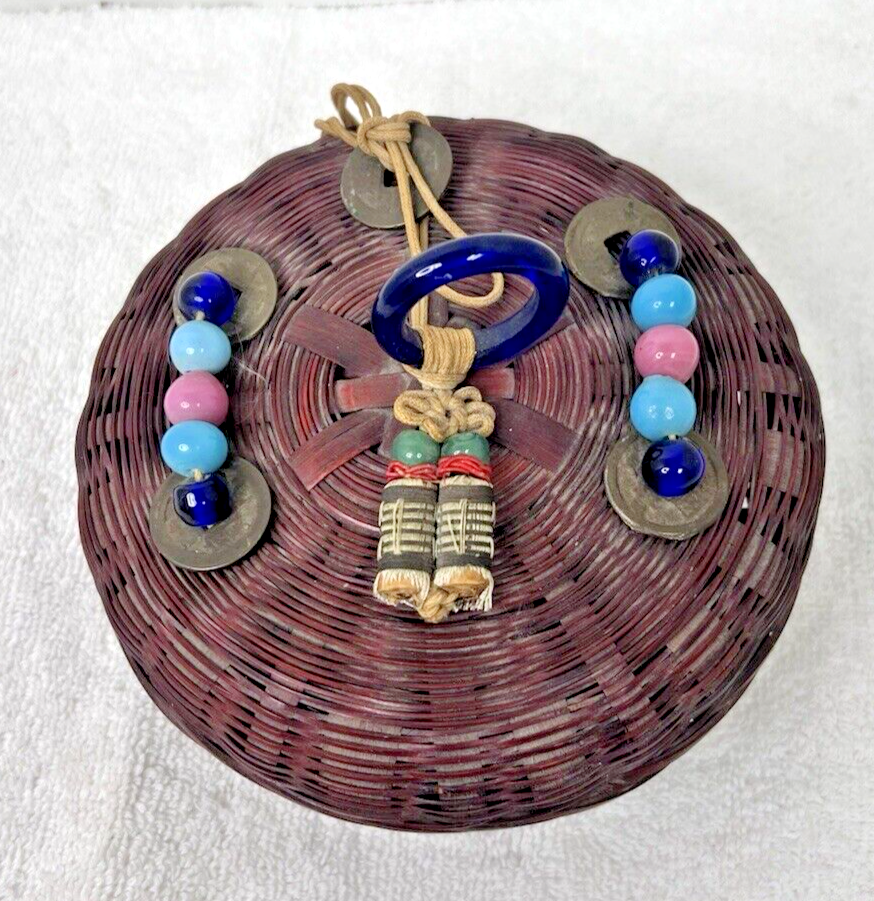 Vintage Chinese Peking Glass Coin Sewing Basket 5 3/4 Inch Across In good shape not sure if the tassels are right? but the glass and coins are in great shape