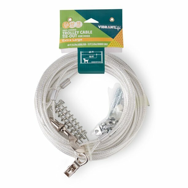 Vibrant Life 60-foot X-Large Vinyl-Covered Trolley Cable Tie-Out with a 10-foot Runner for Dogs is ideal for giving your dog freedom and mobility while keeping them safely in sight. It features two lightweight yet strong steel cables measuring a full 60 feet and 10 feet each. Both cables have a vinyl coating to keep them protected from rain and rust. The 60-foot cable is designed for the aerial run, while the 10-foot runner cable attaches from the aerial run to your pet. With a full 1,200 square feet of playing area made available, your extra-large dog, weighing up to 120 pounds, will love running around in the fresh air and sunlight. Give your dog the exercise and outdoor enjoyment they deserve by bringing home this remarkable Vibrant Life 60-foot X-Large Vinyl-Covered Trolley Cable Tie-Out with 10-foot Runner for Dogs.