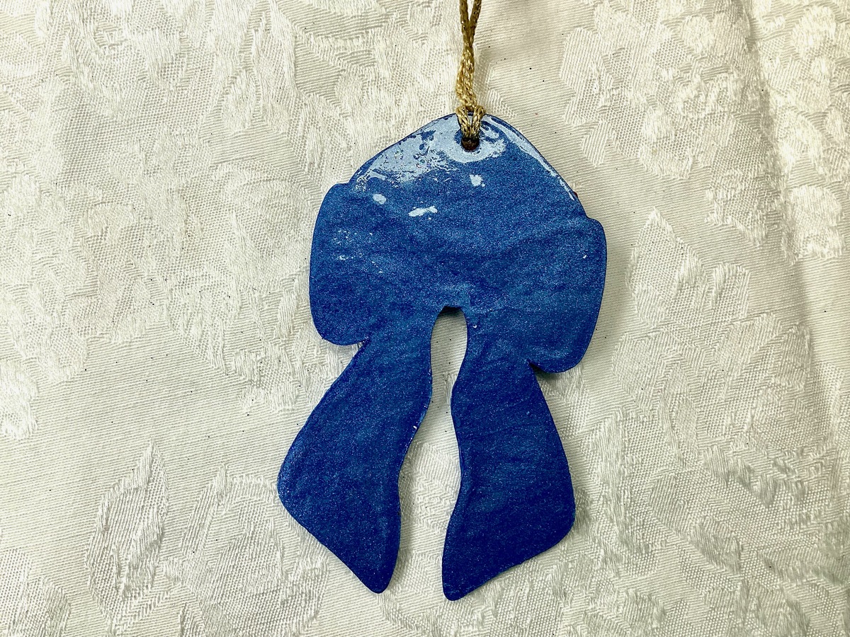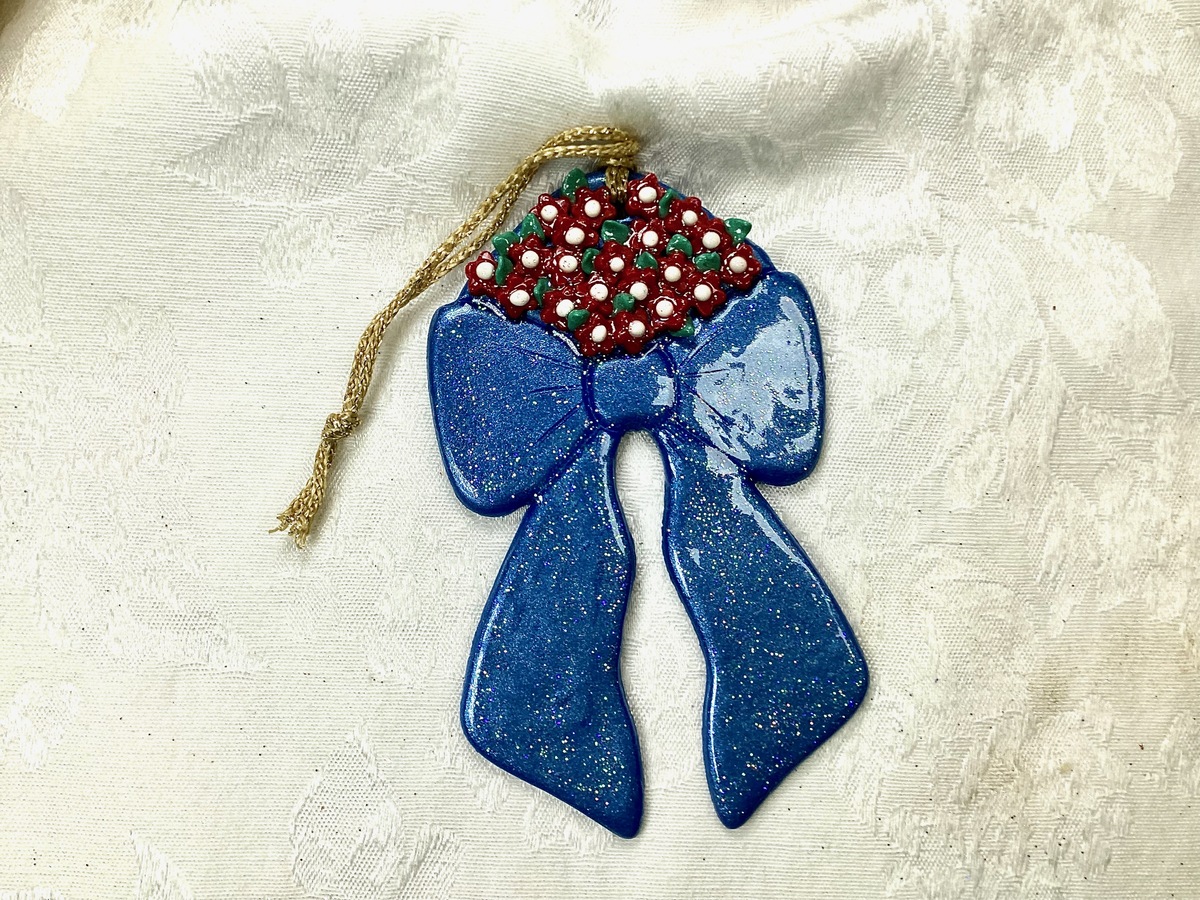 Here is a patriotic Christmas bow ornament. The blue bow has a garden of red and white flowers with green leaves at the top. Glitter adorns the bow and resin coats the entire ornament. It measures 4 1/4" long excluding the hanger and is 2 1/2" wide. In the USA shipping is free.