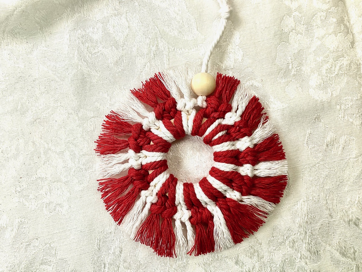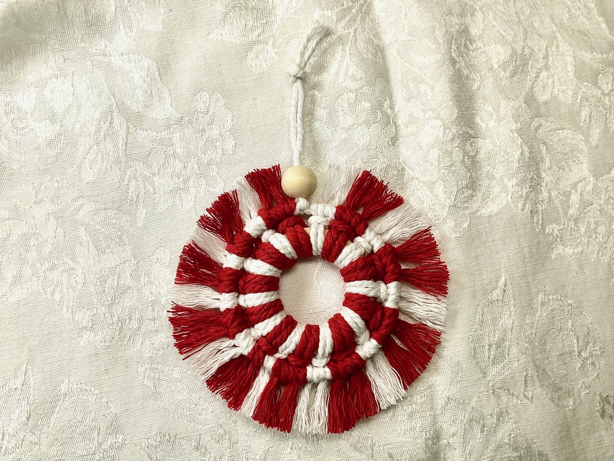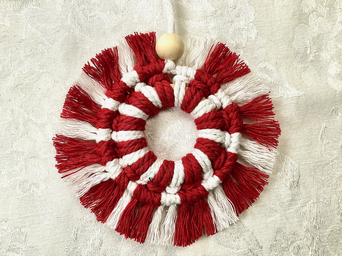 Holiday Christmas Candy Ornament Macrame Handmade Red White Medium Size OOAK