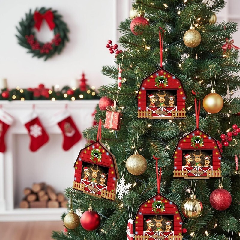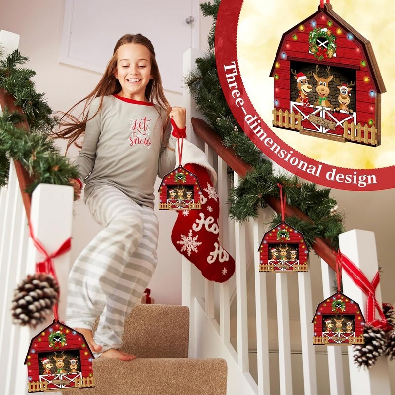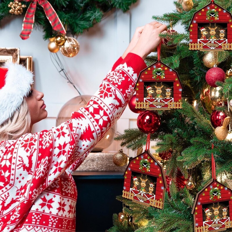 Unique 3D Holiday Design: Crafted with layered depth, the stable scene of reindeer, decorated with colorful lights and wreaths, these deer Christmas tree hanging decorations create a warm Christmas atmosphere that enhances any seasonal decor.