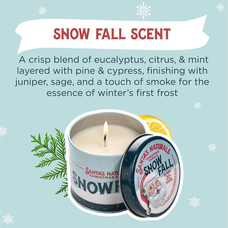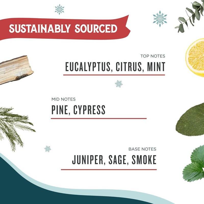 SNOW FALL SCENT - A crisp blend of eucalyptus, citrus, mint layered with pine cypress, finishing with juniper, sage, and a touch of smoke for the essence of winter?s first frost
