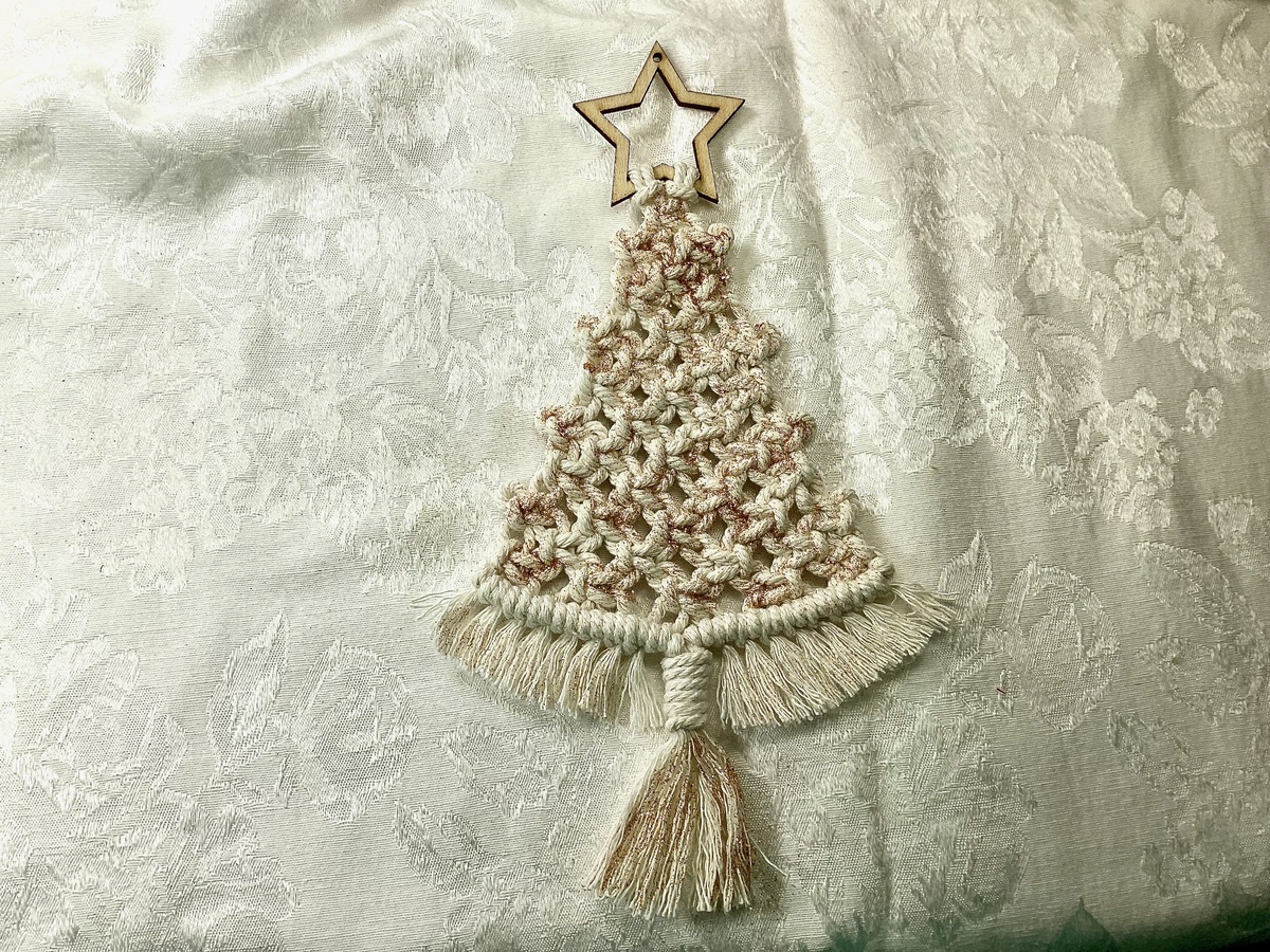 This handmade macrame ornament is made with cream colored cord and gold glitter for sparkle. It has a wooden star on top and is about 9 inches tall. Perfect for your tree or on a giftinstead of a bow. Great keepsake! In the USA shipping is free.