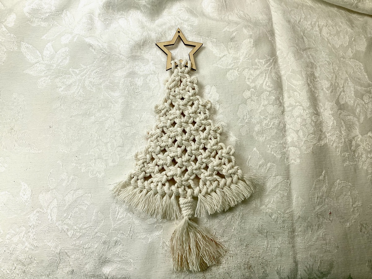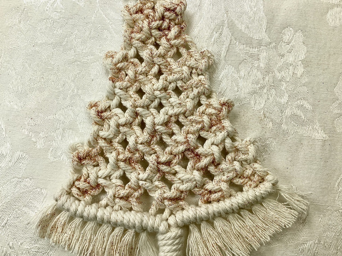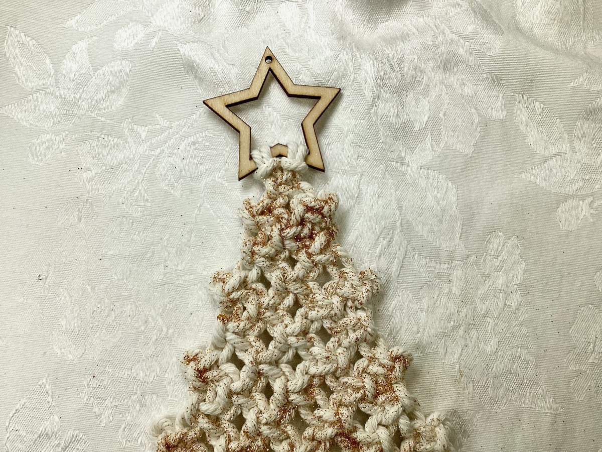 Ornament Macrame Christmas Holiday Tree Cream With Gold Glitter and Wooden Star