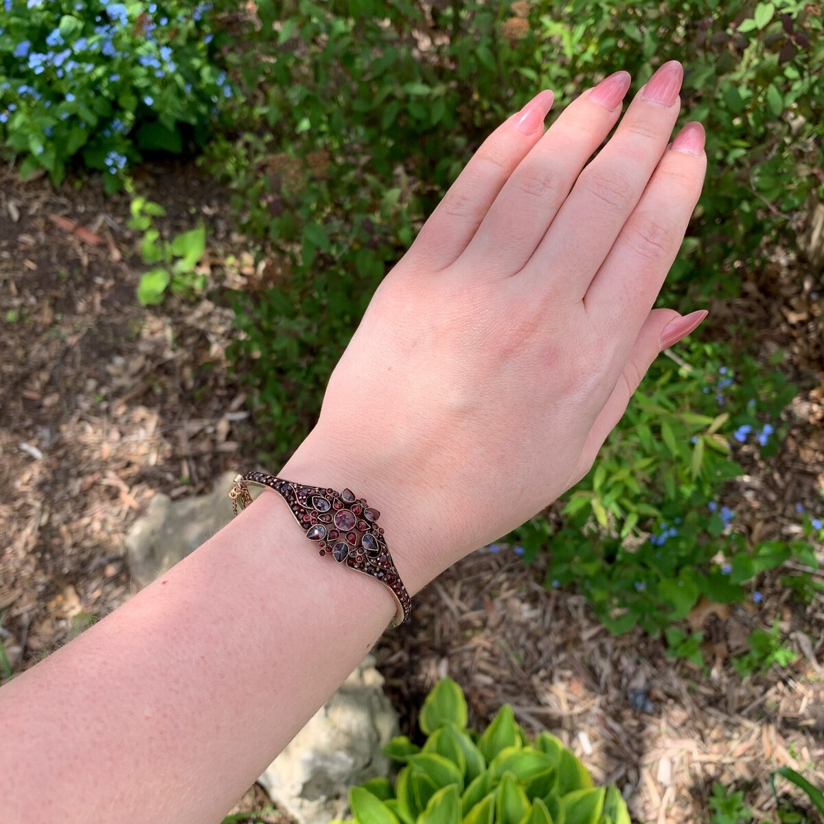 Bohemian garnet bangle bracelet with a beautiful rosette center. The bracelet is made of gilt jeweler's brass. There is a gold filled safety chain. The beautiful rose cut and full cut garnets are a dark red color. The bracelet is an oval shape and fits a size 7.25" wrist. It measures 2 3/8" by 2 1/8" on the interior. The bracelet weighs 10.61 dwt., and dates from the 1880s. Lovely piece! Note: The bracelet is out of round and a little bent. There are some dents, and the safety chain has been added with lead solder. Being offered as-is.