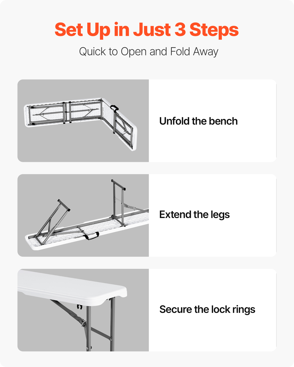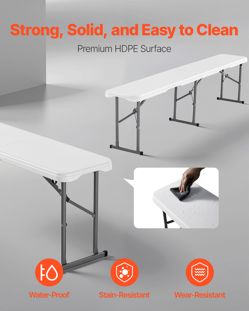 Comfortable Seating: This 71.3x11.0x16.9 inch / 1820x280x430 mm 2-piece portable 6FT folding bench is highly portable and lightweight, with comfortable seating. No assembly is required—ready to use right out of the box