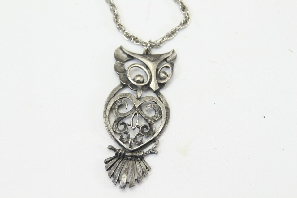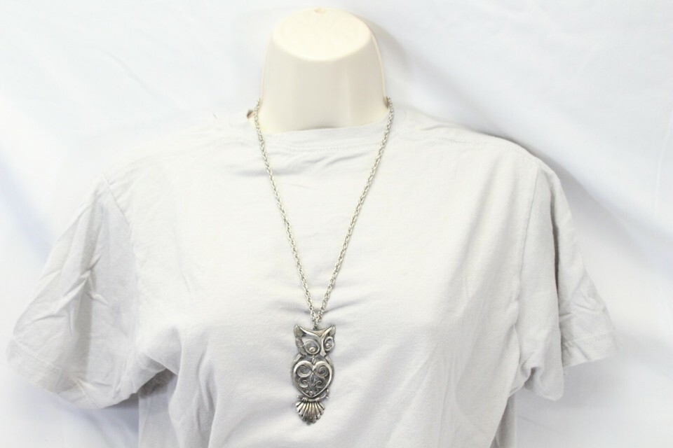 Torino Screech Horned Owl Necklace 24" Pewter Heart Silver Tone