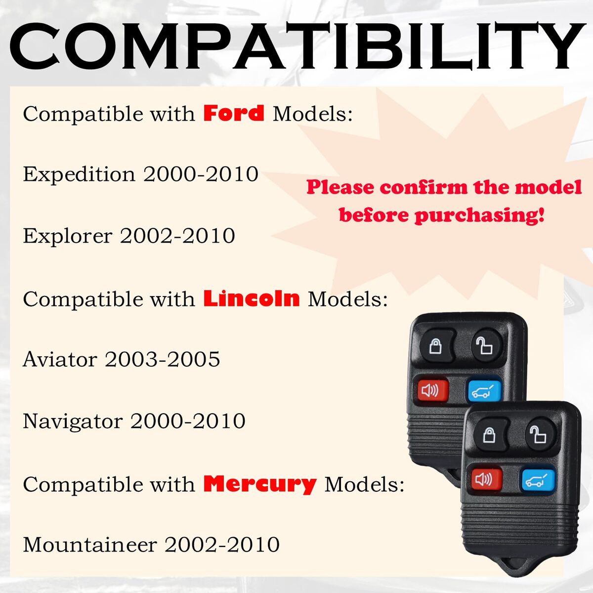 COMPATIBILITY: Compatible with FCC ID CWTWB1U322. Please Check Our Product Description and Vehicle Fitment Tool for Full Compatible Vehicles List. This Remote Key Fob Replacement Is Compatible with Ford Expedition 2000-2010, Ford Explorer 2002-2010, Lincoln Aviator 2003-2005, Lincoln Navigator 2000-2010, Mercury Mountaineer 2002-2010.