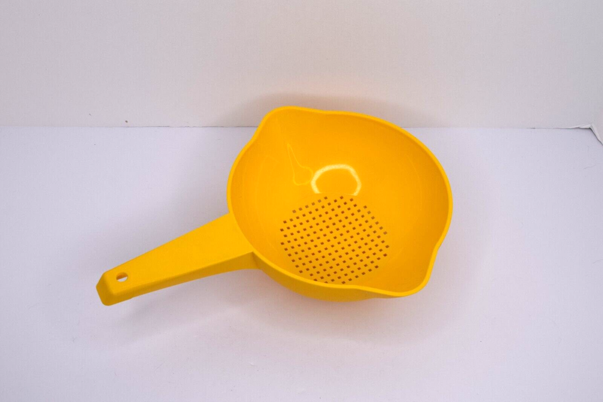 Vintage Tupperware Yellow Colander Strainer 1 Quart with Handle Double Spout. Pre-owned in good condition. Has some light to moderate signs of wear and use. Some light discoloration on some of the corners of the handle. See all photos for details and condition. Will ship USPS Ground Advantage.