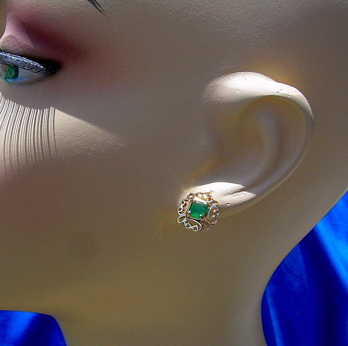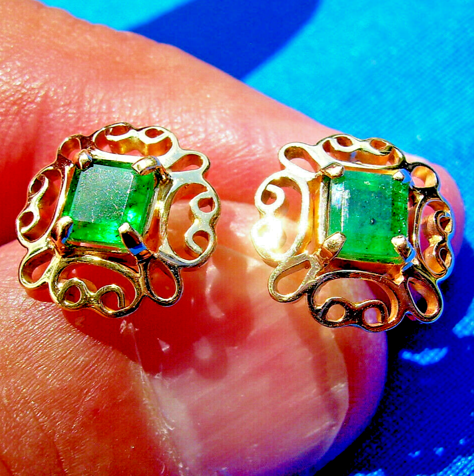 Earth mined Emerald Deco Design Earrings Unique Vintage Studs Solid 14k Gold