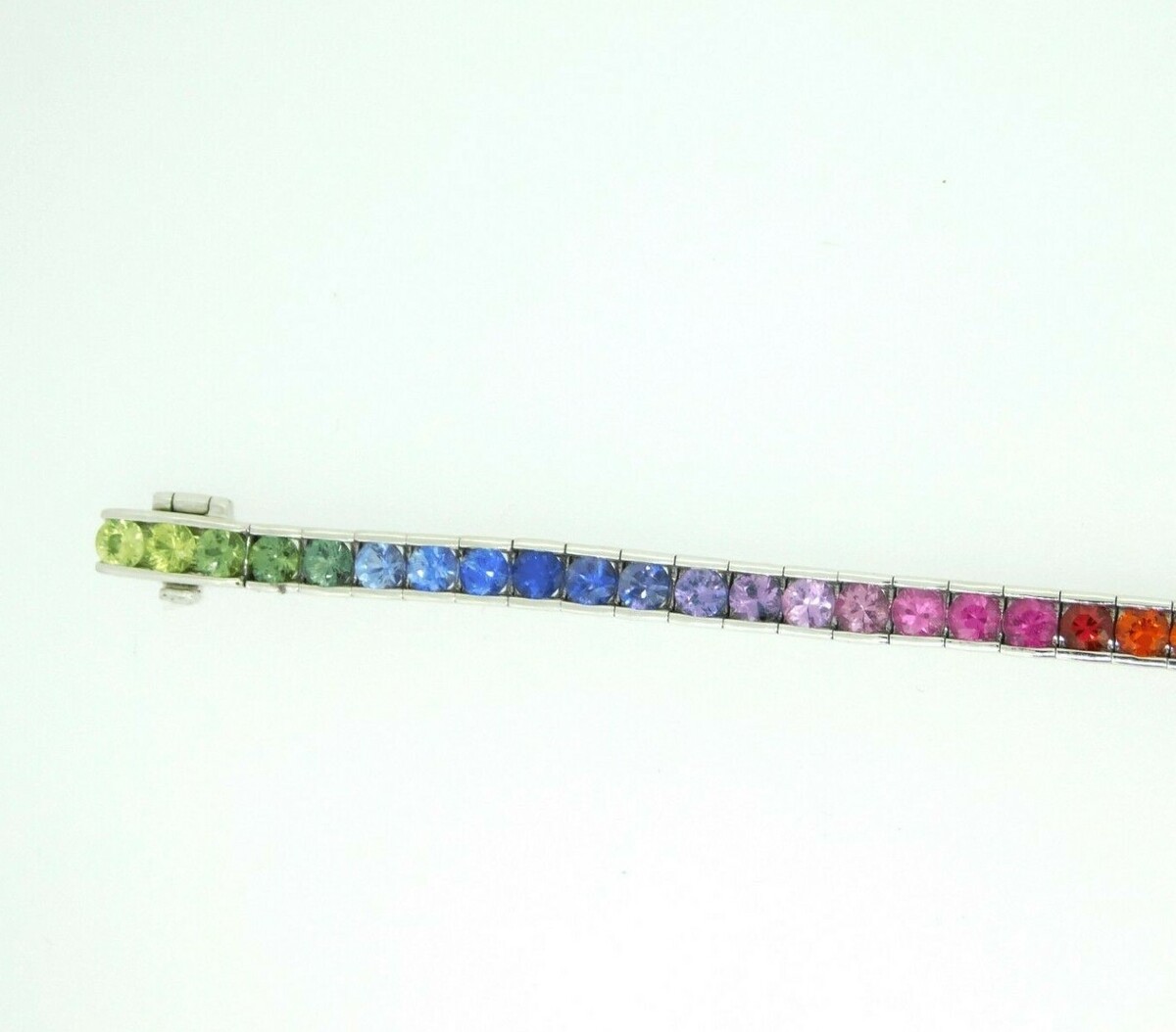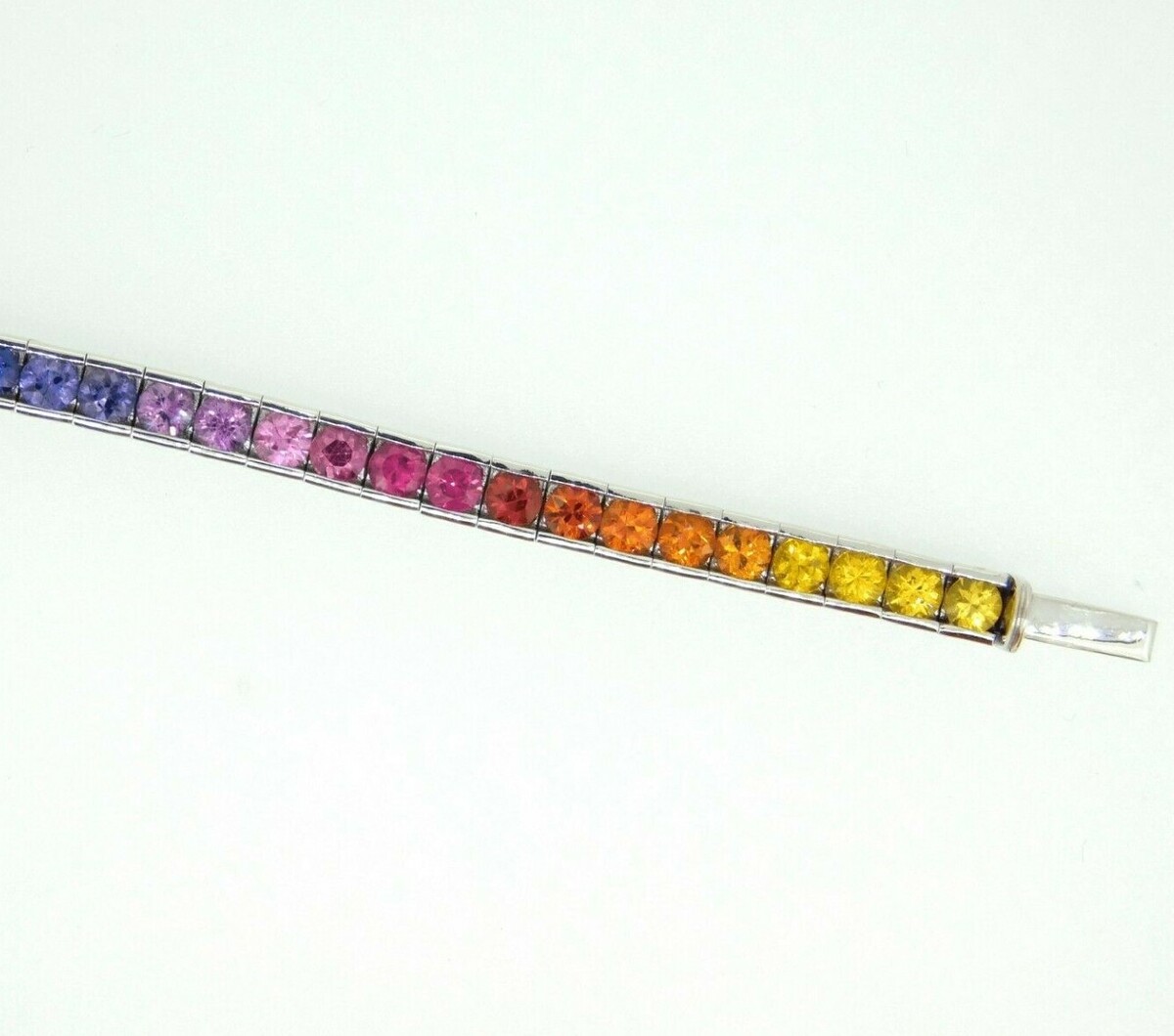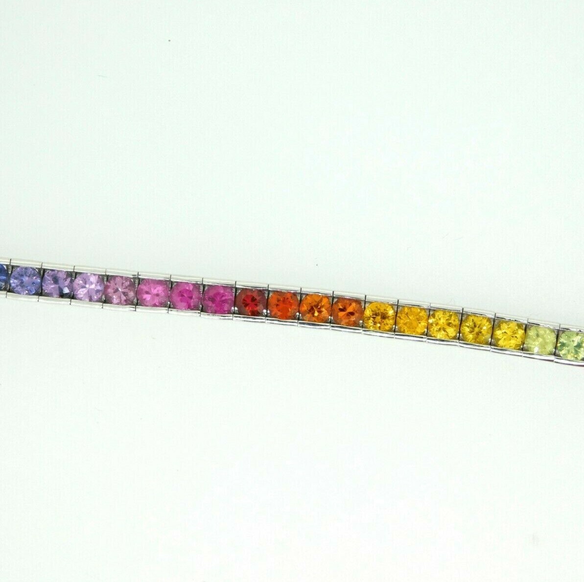 14k white gold bracelet featuring 8.70 carats of diamond cut round sapphires. The sapphires have bold primary colors including blue, green, yellow, orange, pink, and purple. This is double rainbow meaning that there are two sections of each color.