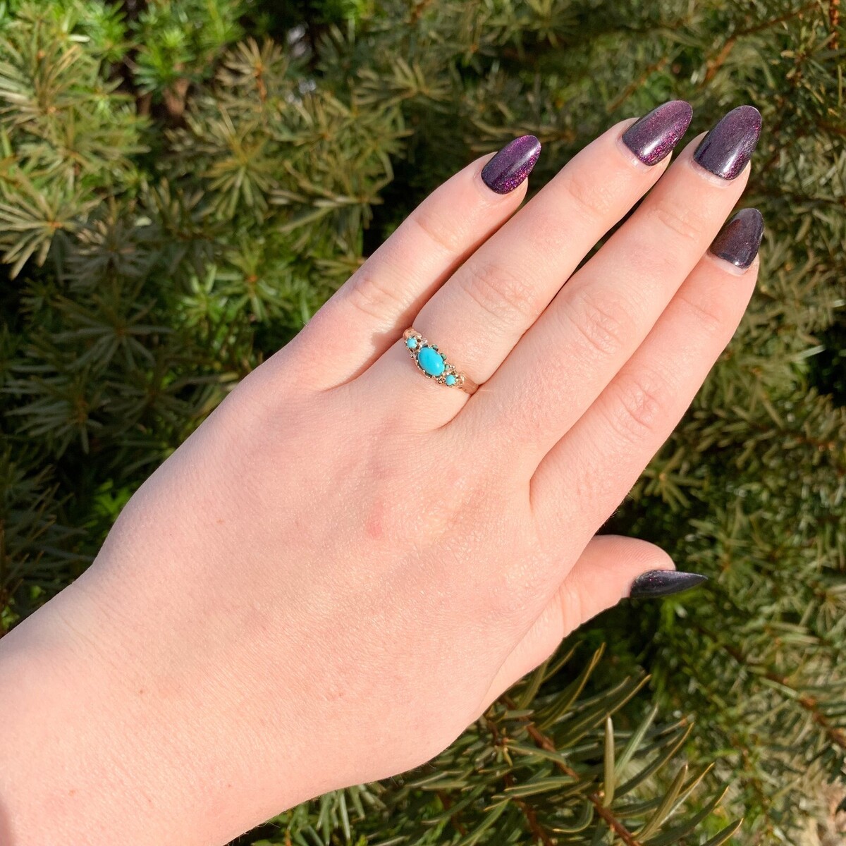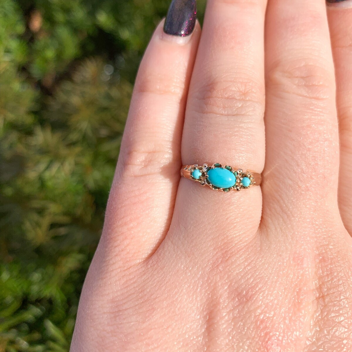 Victorian 10k rose gold turquoise ring. There are three small genuine turquoise cabochons. The oval measures about 6mm x 4mm, and there are two rounds measuring about 2mm. The ring fits a size 7.25 finger, weighs .72 dwt., and dates from the 1890s. Terrific!