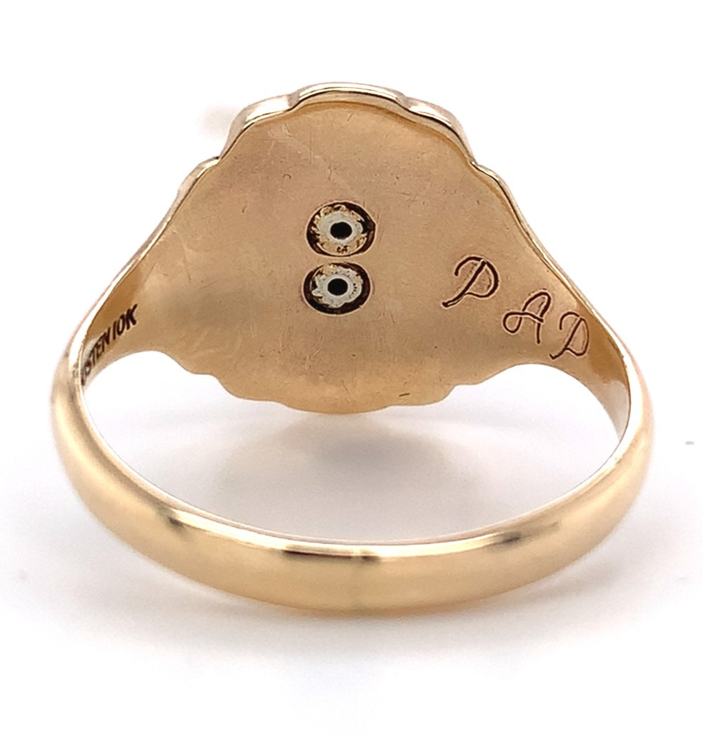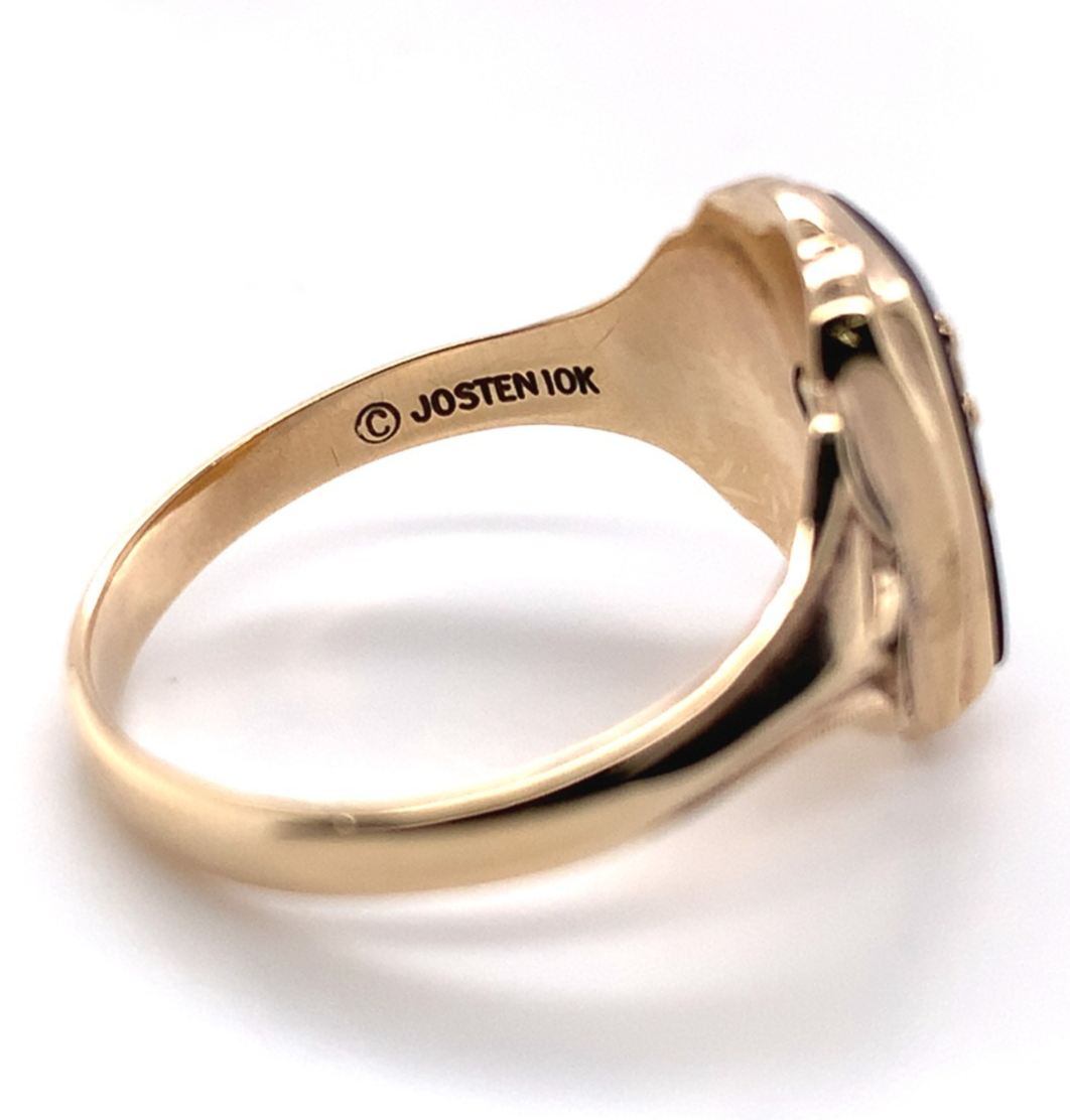 10k yellow gold Josten's class ring with black onyx and applied 10k yellow gold initial "I". The ring has "19" on the left and "69" on the right with black enamel. Engraved on the inside "PAP". Looks unworn, new old stock. The ring fits a size 8.5 finger and weighs 2.44 dwt. It is dated 1969. Terrific!