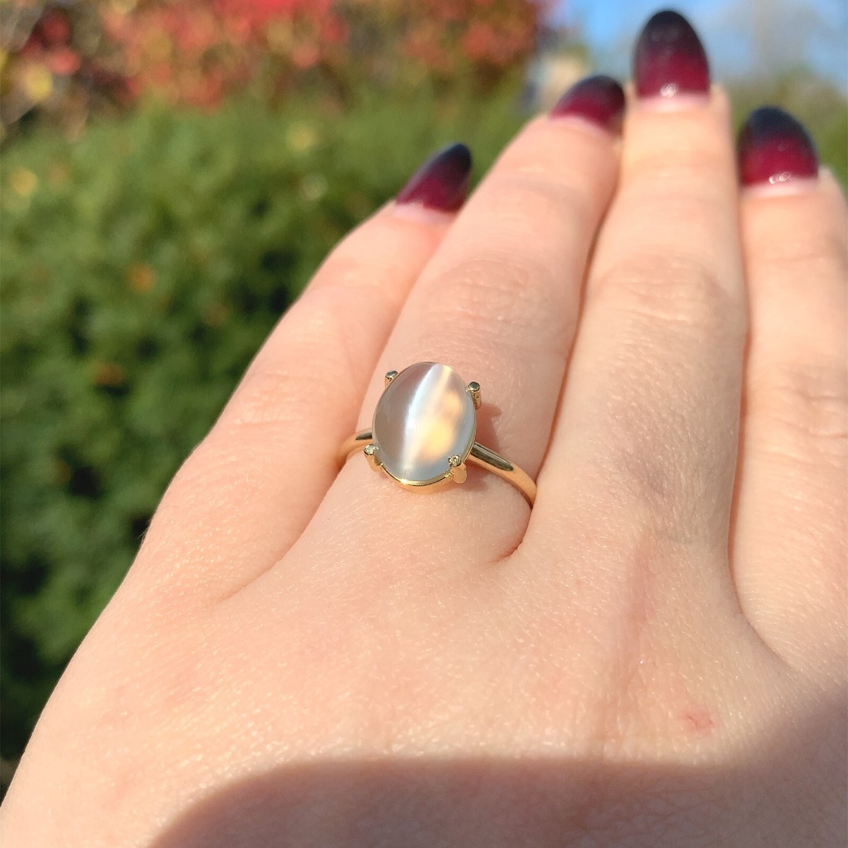 14k yellow gold ring featuring an oval moonstone. The moonstone measures about 10.7mm x 8.4mm and weighs 3.62 carats. The oval moonstone is clear transparent with a grey/white cat's eye flash. The ring fits a size 6.75 finger and weighs 1.91 dwt. It is a vintage ring with a new head and center stone. Gorgeous!