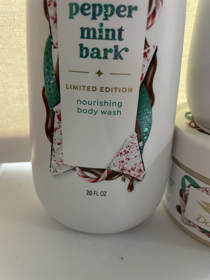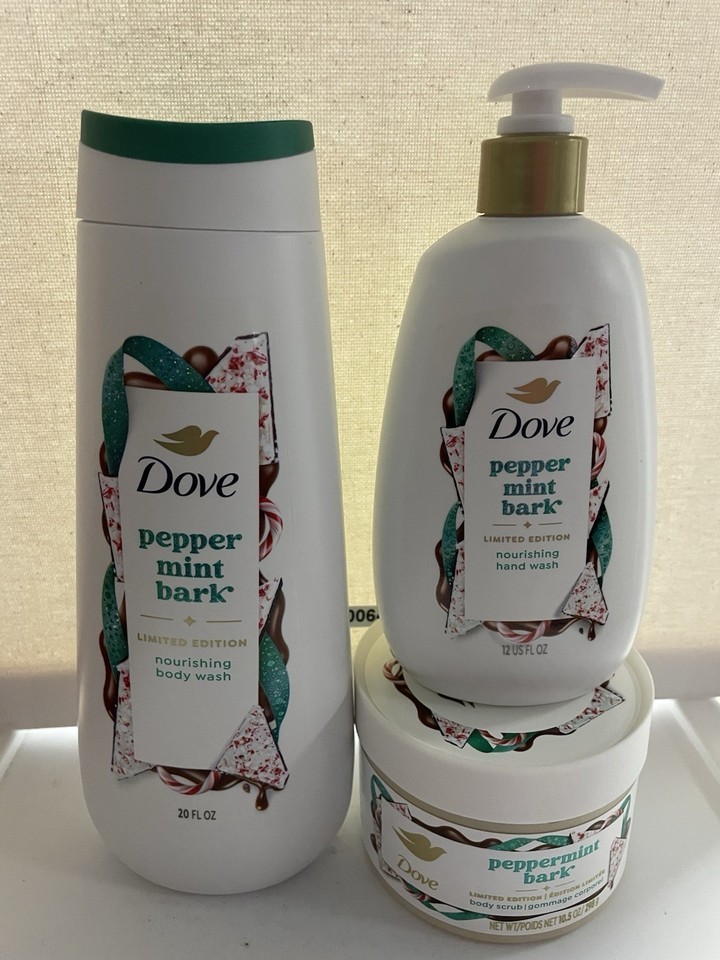 3 Pack Dove PEPPERMINT BARK Hand Soap Body Wash Body Scrub Set New.