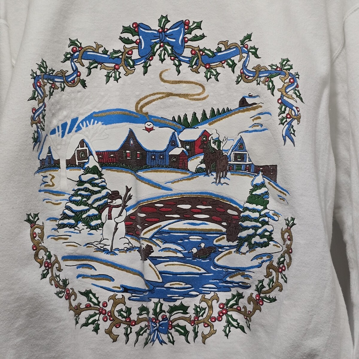 Excellent Condition Vintage 80s Christmas Winter Wonderland White Crewneck Sweatshirt - Missing Tag. Men's Size L. Actual measurements: 47" chest, 27" length.