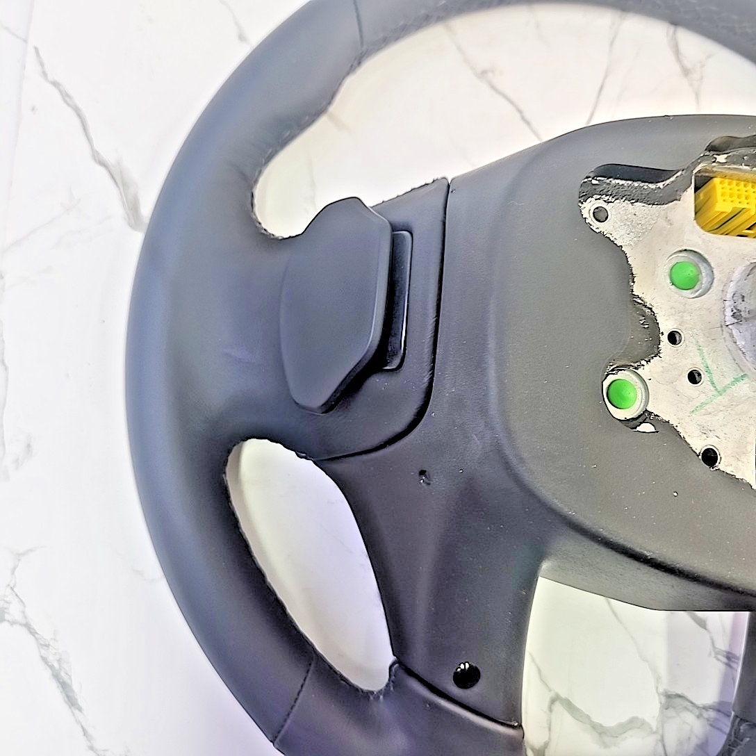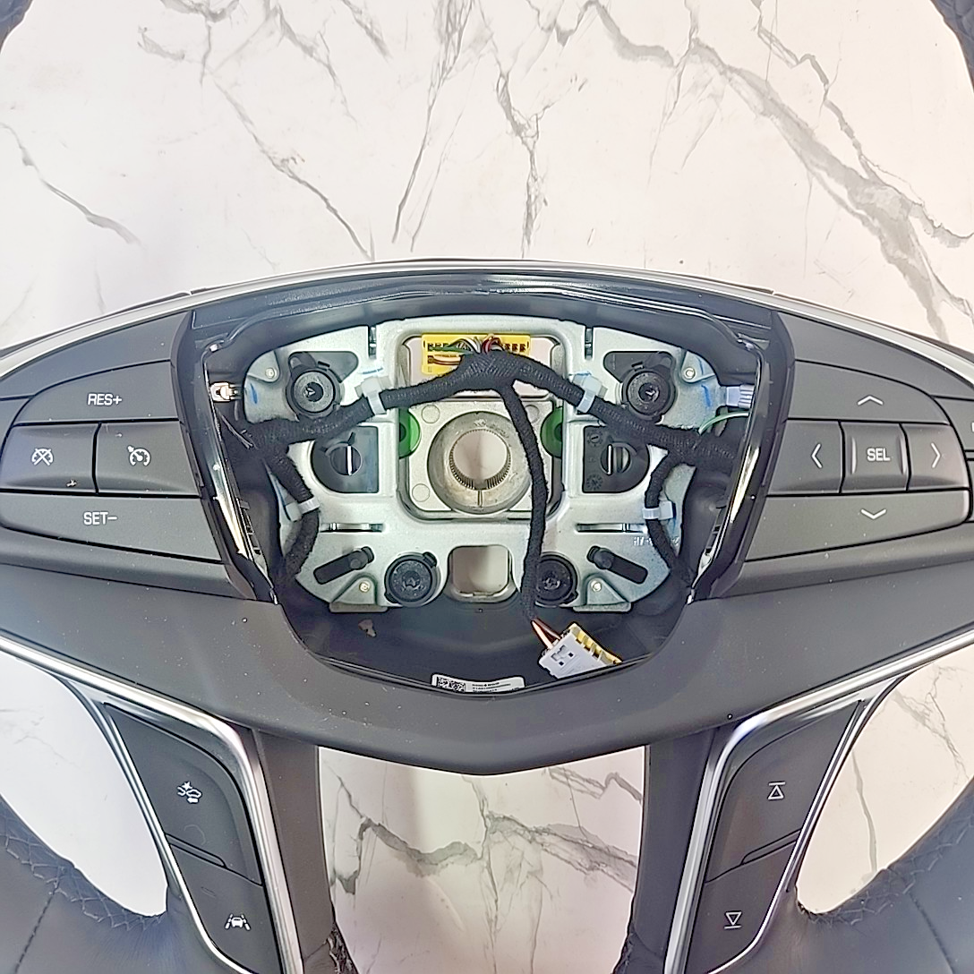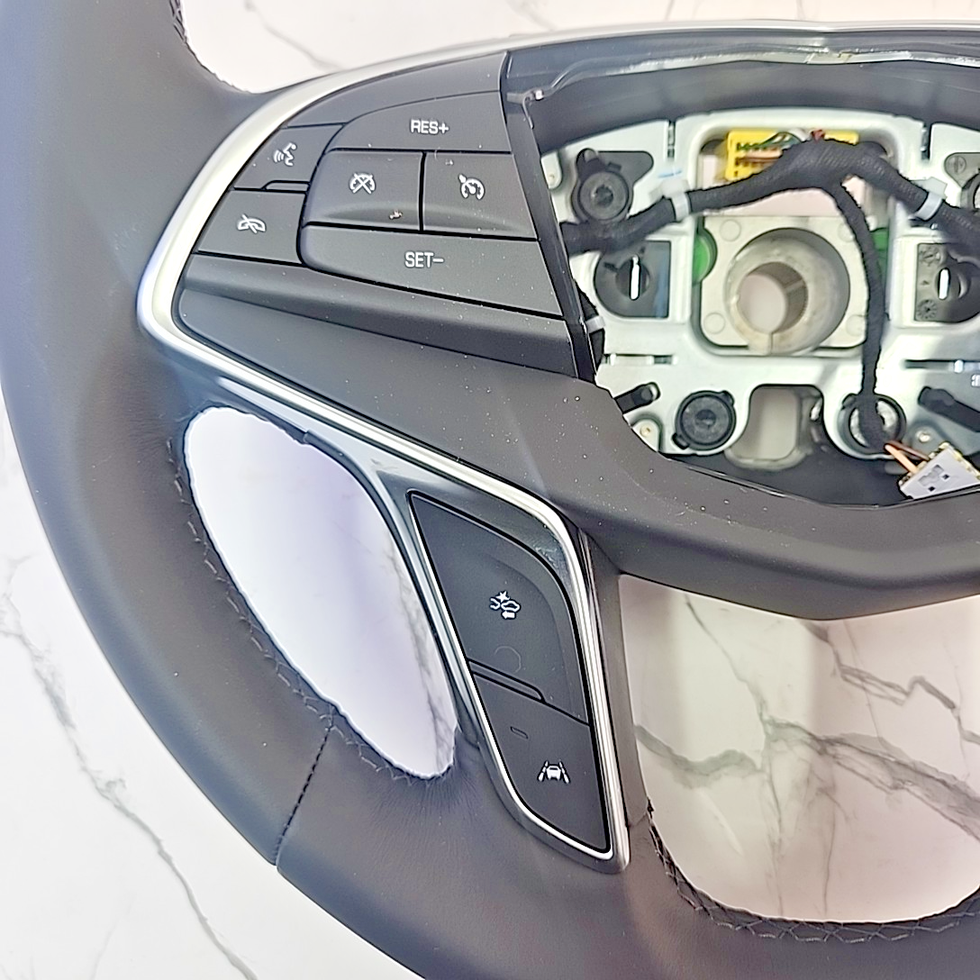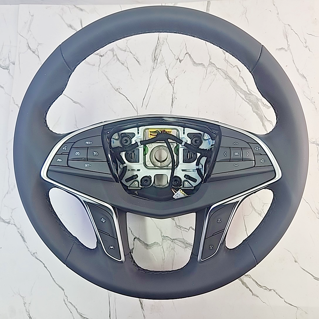 The GM 84904059 Jet Black Steering Wheel is an OEM genuine NORS part specifically designed for 2016-2020 Cadillac CT6 vehicles. This leather steering wheel features telephone controls, cruise control, horn controls, multifunctional capabilities, and stereo controls. With its sleek black color and quality construction, this steering wheel is a perfect replacement part for Cadillac owners looking to enhance their driving experience. Made by GM in Mexico, this steering wheel is sure to provide both style and functionality for your vehicle.