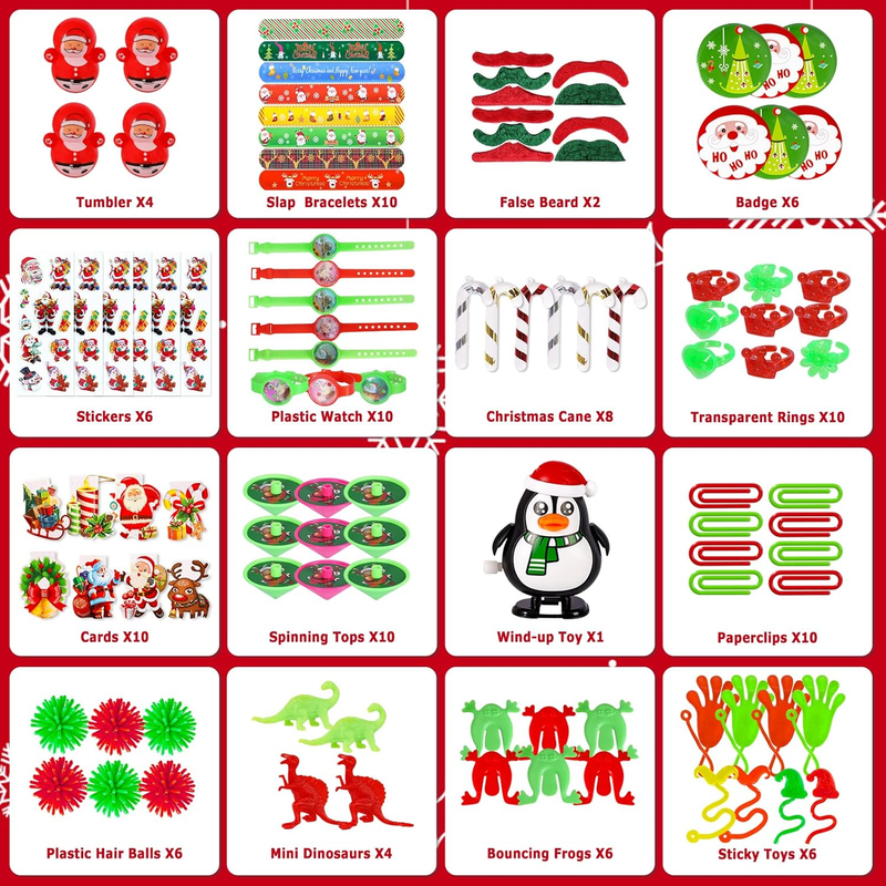 Christmas Party Favors: You will get 41 kinds 200pcs of Christmas toys, Including rainbow circle,ring, tattoo stick, sticky hat, sticky beard, Santa Claus, folding rope, rubber , Christmas key chain, sticky palm, clapping ring, face changing doll, beard, badge, sticker, watch, puzzle, whistle, Christmas pendant, and much more fun items.
