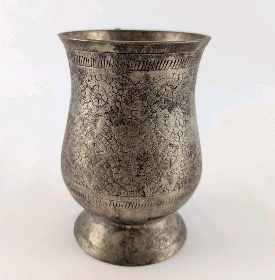Unique decorative metal tankard/mug featuring a ?Saudi Arabia? crest and floral-textured body, approx. 5 inches tall (see tape measure photos).