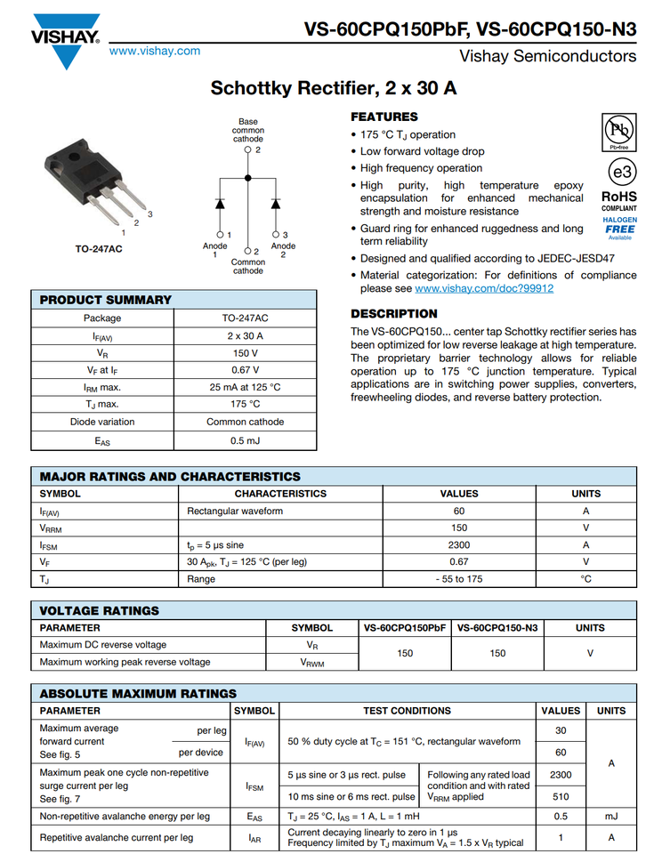 2PCS VS-60CPQ150PBF 60CPQ150 Vishay Schottky and 50 similar items