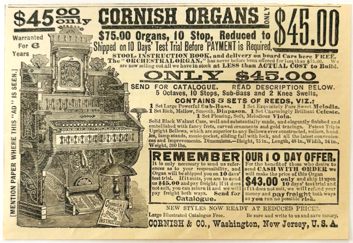 1886 Cornish Reed Organ Advertisement and similar items