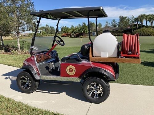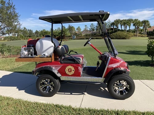 Custom Built Wildfire Protection Fire Pump and Hose System designed specifically for Club Car DS Golf Cart models.
