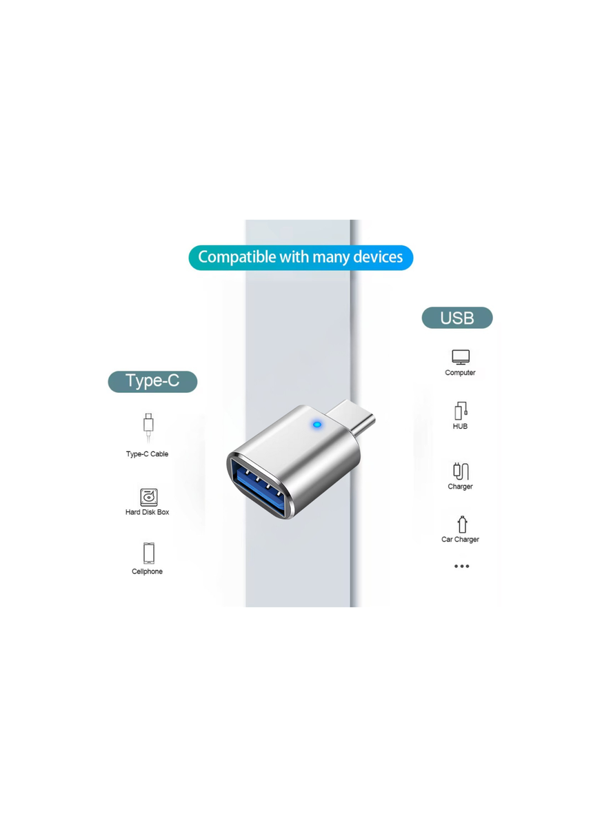 The USB 3.0 Female to Type C Male Adapter is designed for high-speed data transfer. It features an LED light for visibility. The adapter comes in a sleek silver color, enhancing its aesthetic appeal. Perfect for users needing a reliable data transfer solution.