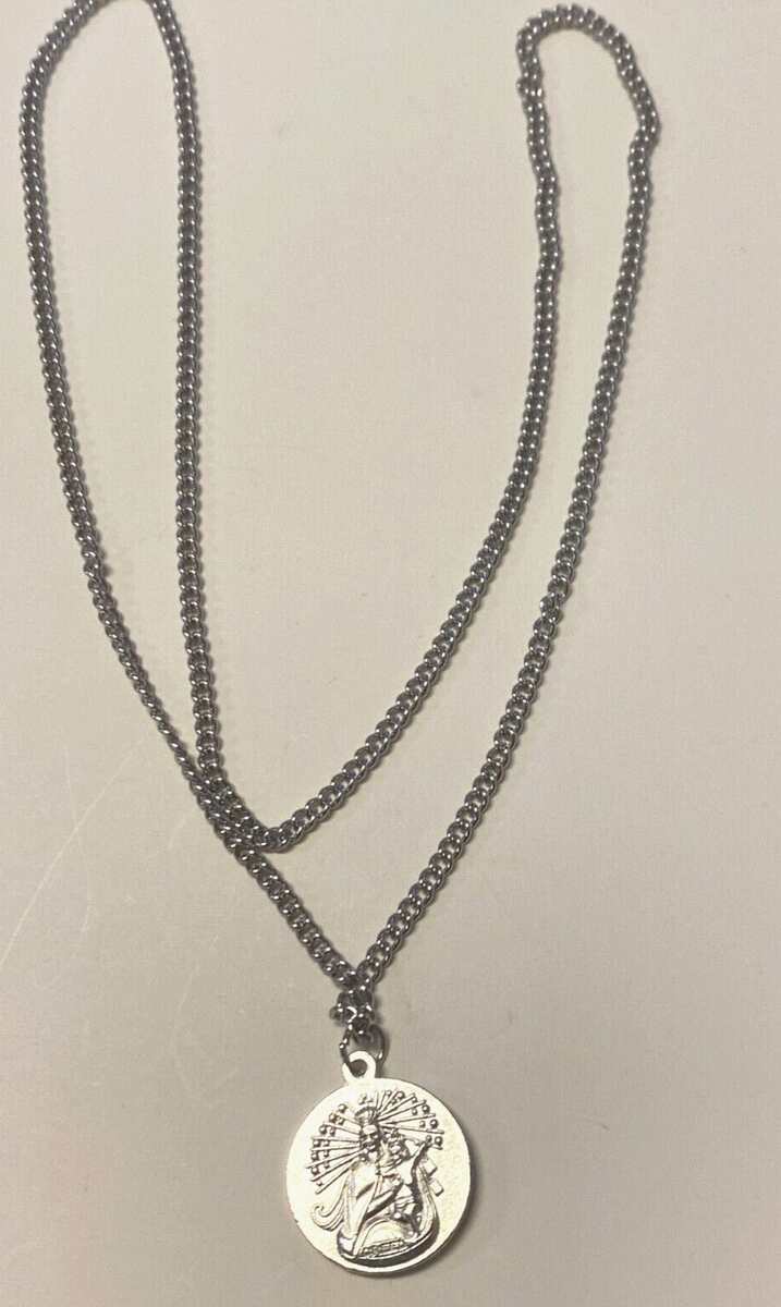 Comes with a cable 24" oxidized silver plated. It does not have a clasp to put on remove, it's over the head. The medal measures .75 in diameter. Comes from the Berkander Collection. Comes in a acrylic gift box.