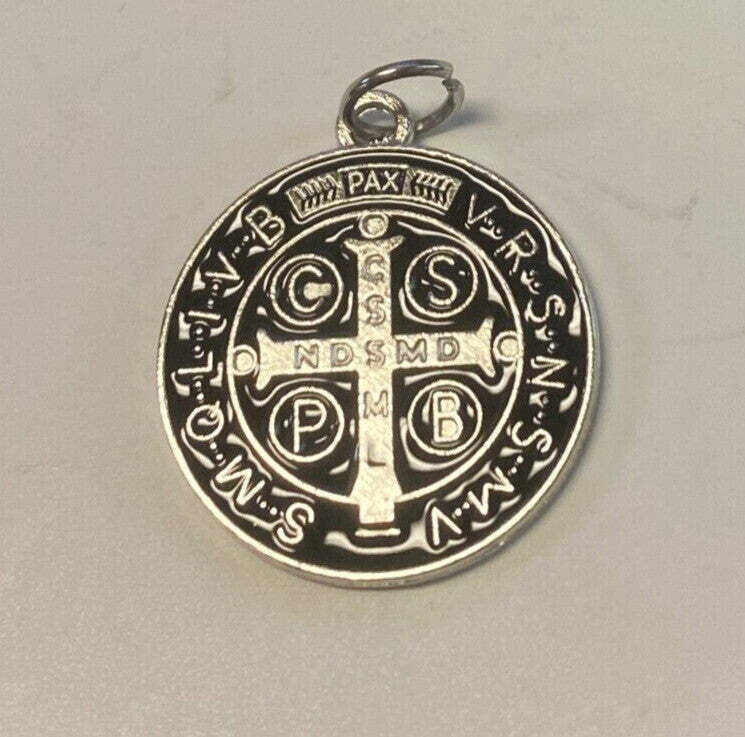 Your purchase is for a Saint Benedict black silver tone medal. It is very nice medal. Made of zinc alloy. Measures approximately 1" diam, the size of a quarter. Please see pictures for details.