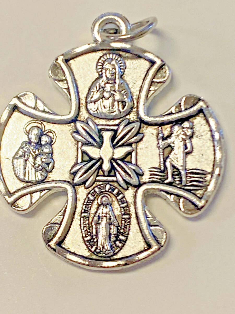 You are purchasing a very nice 4 in one cross with the dove, in representation of the Holy Spirit on the center. Each corner it has Sacred Heart of Jesus, Saint Christopher, Saint Joseph Our Lady of the Miraculous Medal.