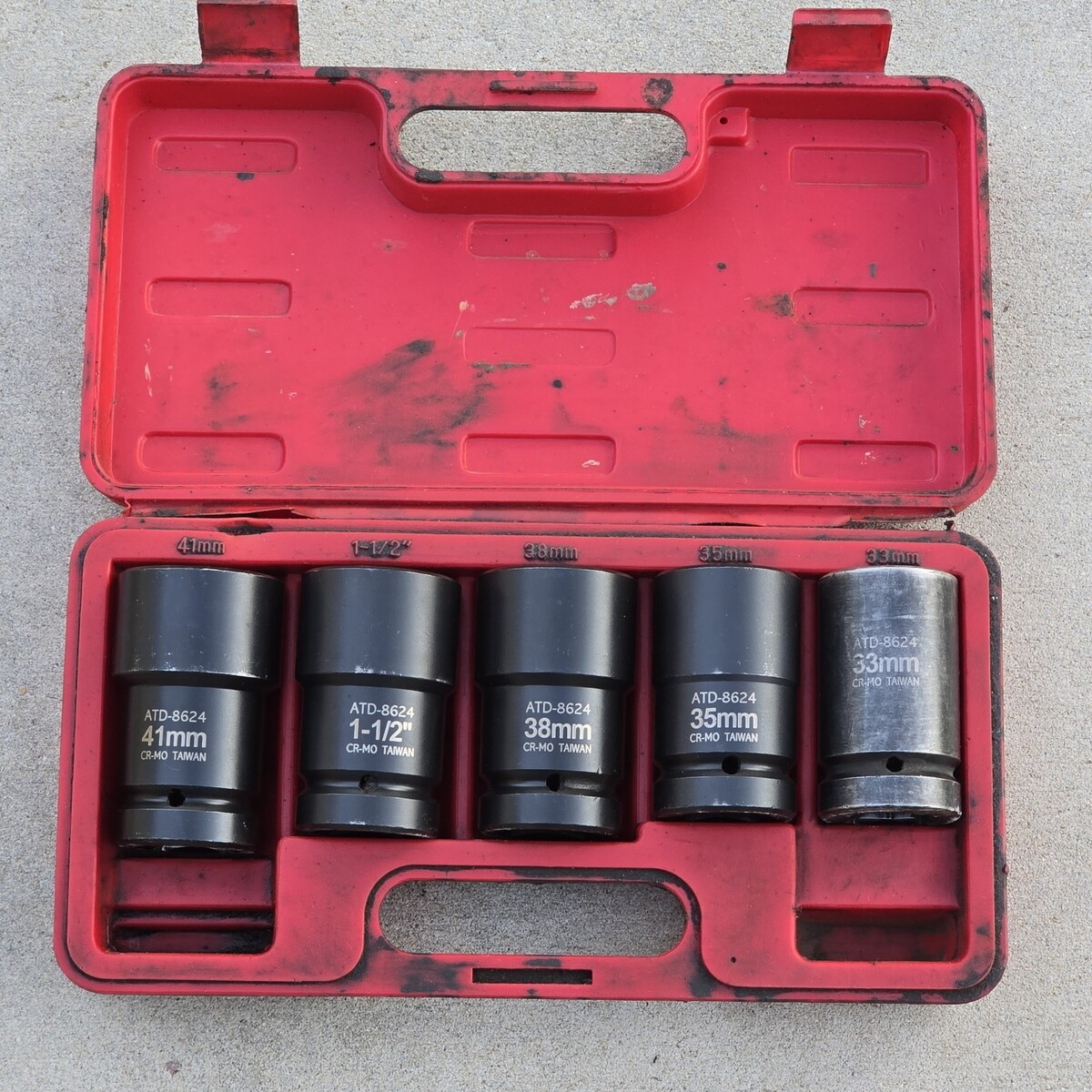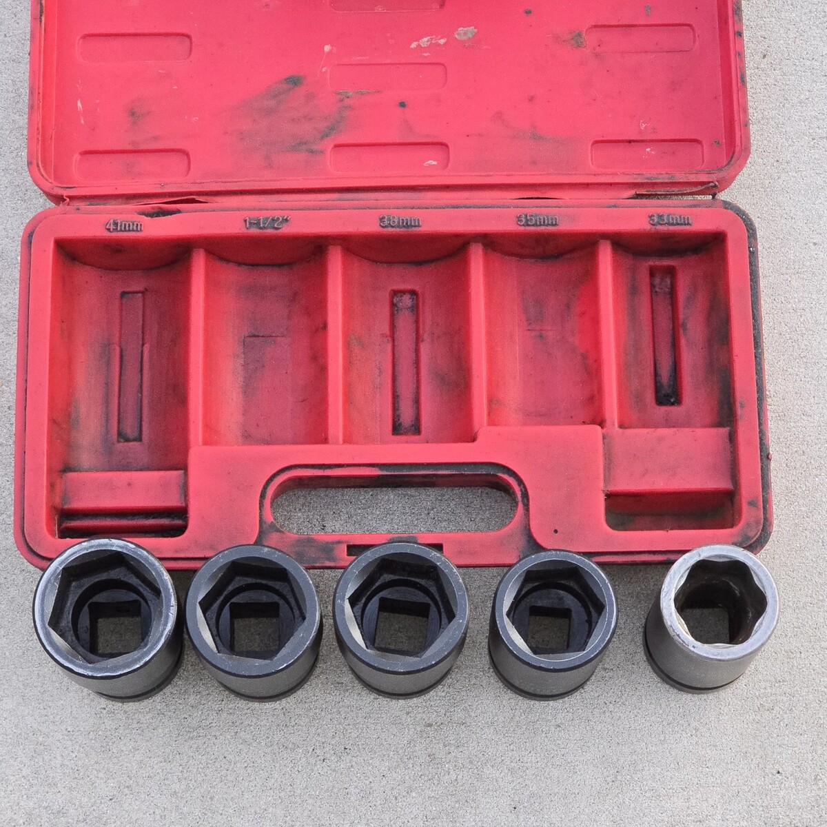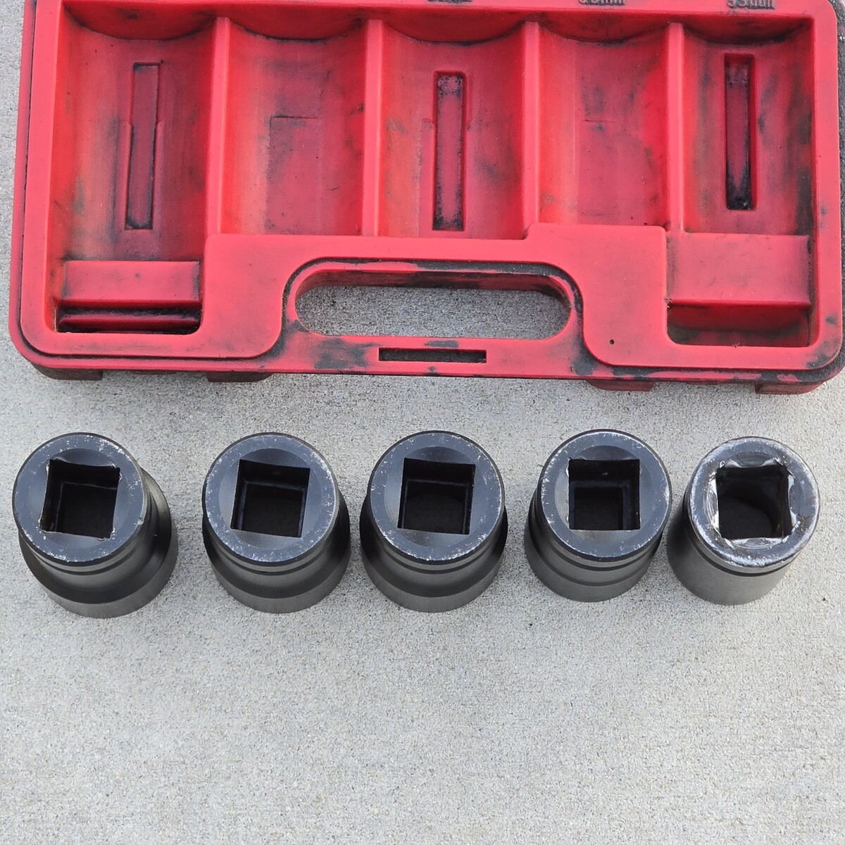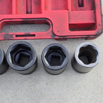 ***Used set overall in great condition. Red case is extremely dirty. Some sockets have leftover grease, dirt, and grime inside. The 33mm socket shows significantly more wear than the others, with the remaining sockets appearing lightly used by comparison. Comes exactly as pictured. Please see photos.***