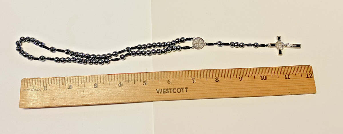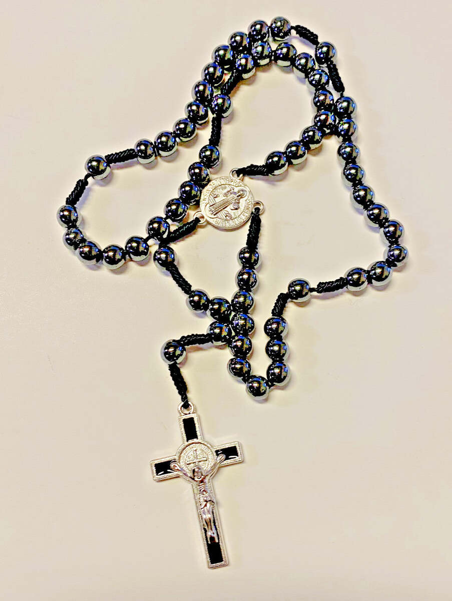 Your purchase is for a very nice hematite corded small rosary pouch with the medal of Saint Benedict on the center and as well as in the crucifix. (see pictures).
