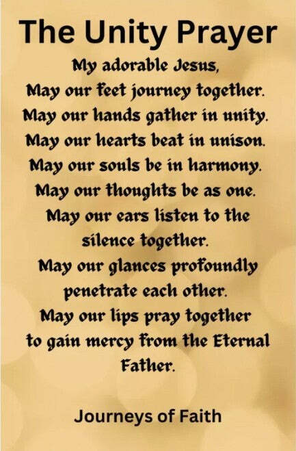 it reads: My Adorable Jesus, May our feet journey together, May our hands gather in unity, May our hearts beat in unison, May our souls be in harmony, May our thoughts be as one, May our ears listen to the silence together, May our glances profoundly penetrate each other, May our lips pray together to gain mercy from the Eternal Father. Amen