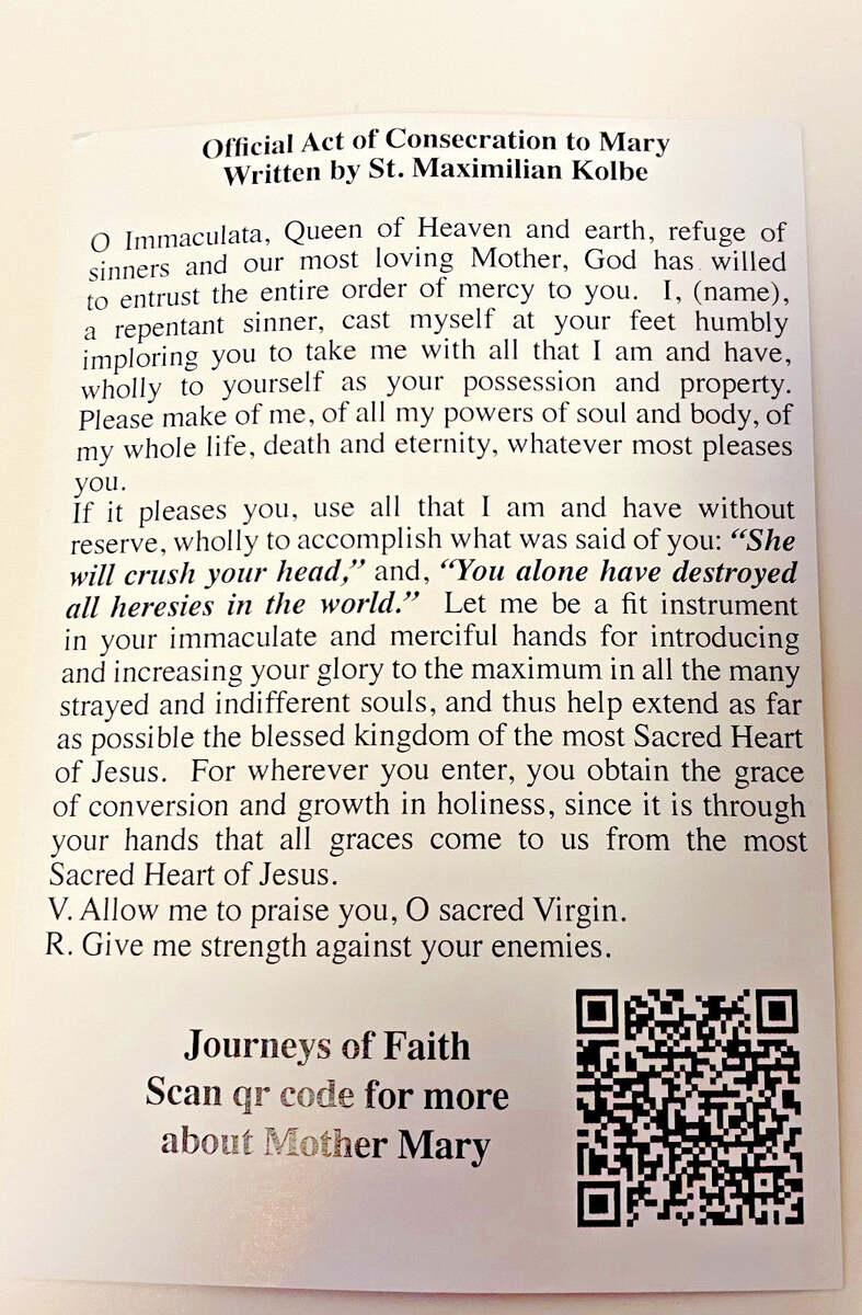 You are purchasing a very nice official Act of Consecration to Mary written by Saint Maximilian Kolbe, to whom he had great devotion to.