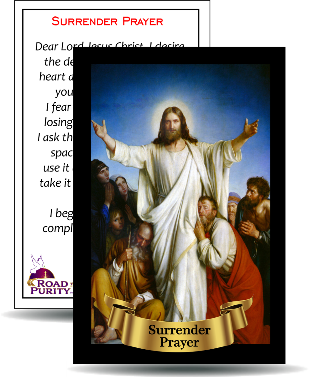 Surrender Prayer Holy card is printed on heavy card stock with a laminate finish. Size is 2 1/4" x 3 1/2" (credit card size).