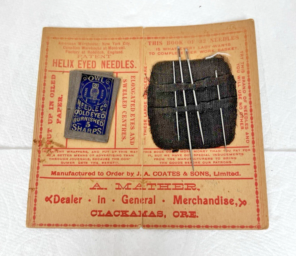 Victorian Sewing Society Needle Book w Children on Cover 4 3/4 x 2 5/8 inch The bottom fold over seam is torn or loose but the book is not apart paper has wear and we don't know if all the needles are here