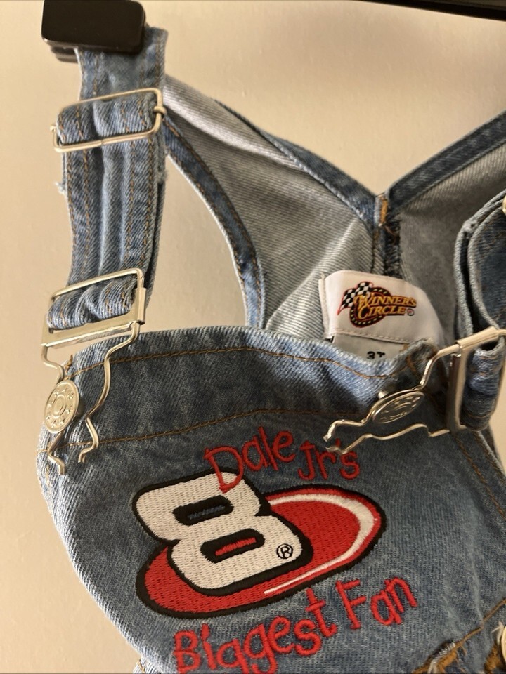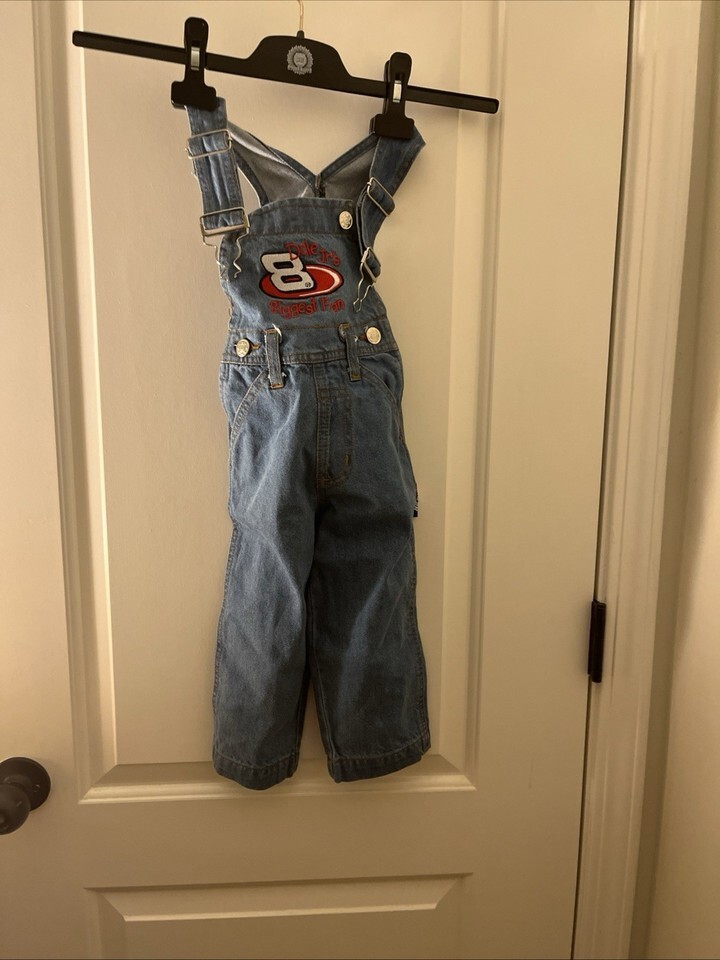 Vintage Dale Earnhardt Jr #8 Denim Bib Overalls NASCAR Toddler Boys Size 3T Blue in good condition. The clasps are completely broken where you fasten the overalls together. View images carefully.