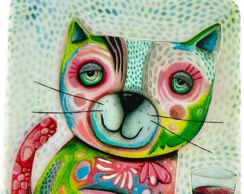 Whimsical Compact Colorful Art Cat with a Glass of Red Wine