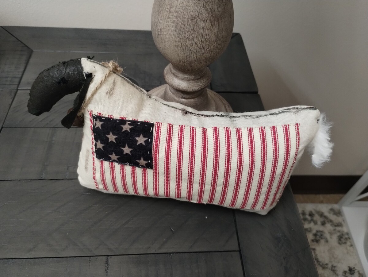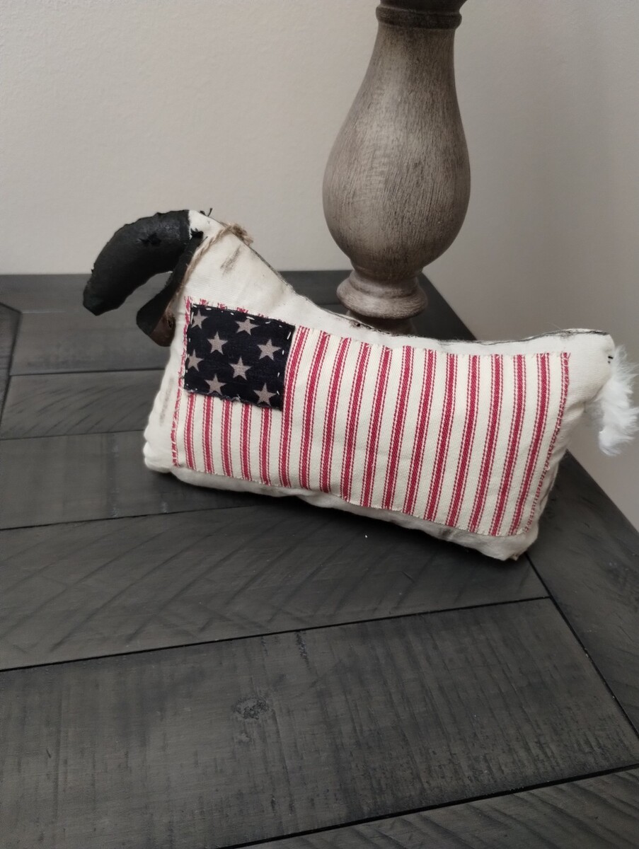 Add rustic charm to your home with this hand-sewn primitive Americana sheep shelf sitter. Made with distressed muslin, red ticking stripes, and a navy star flag patch, this piece is perfect for primitive, patriotic, and farmhouse decor.