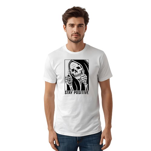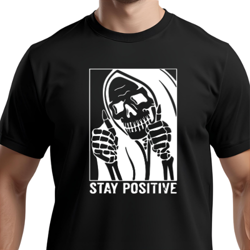 Grim Reaper “Stay Positive” T-Shirt – Ironic Skeleton Unisex Graphic Tee
