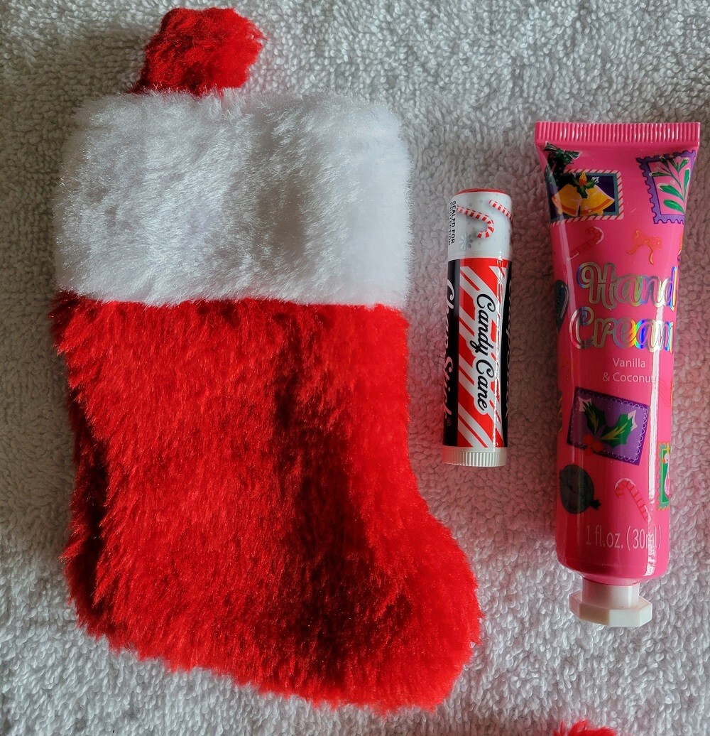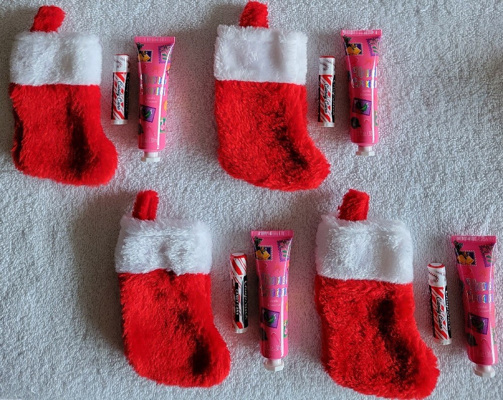 Mini Red fuzzy stockings included with a lip balm and a hand cream
