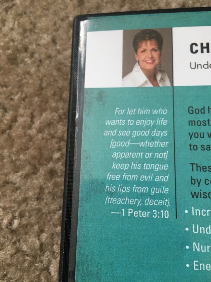Change Your Words Change Your Life...Joyce Meyer Religious 4 CD Set in great overall condition. There are a few scratches on some of the CD's but all play very good. The CD 's plastic cover is torn and wrinkled in places but no damage to the CD's whatsoever.