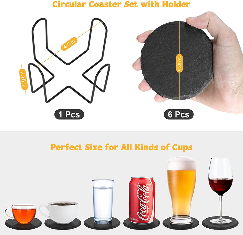 Ideal Size Coaster Set with Holder - Package includes 6pcs of slate coasters (4 inch, Round) and a black metal holder (Anti-Rust), which fit almost all kinds of drinks, cups and mugs, like coffee, beer, wine, juice, tea. Widely used for home, kitchen, bar, dining, party, coffee house, table, etc