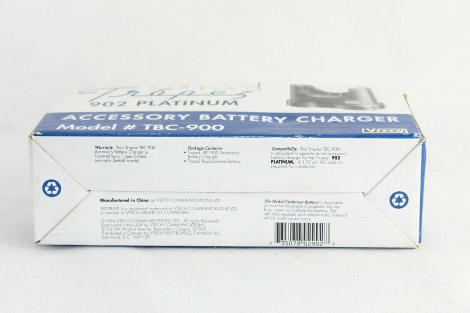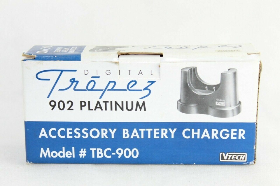 Description of item: The Vtech Digital Tropez 902 Platinum Accessory Battery Charger, model TBC-900, is designed to keep your compatible devices powered up and ready to go. This charger is an essential accessory for users who frequently use Vtech products, offering a convenient and reliable charging solution. With its durable design and easy-to-use features, this charger ensures your devices are always charged and at peak performance, making it a valuable addition to your technology toolkit. Ideal for home or office use, it's a practical choice for maintaining the functionality of your digital devices.