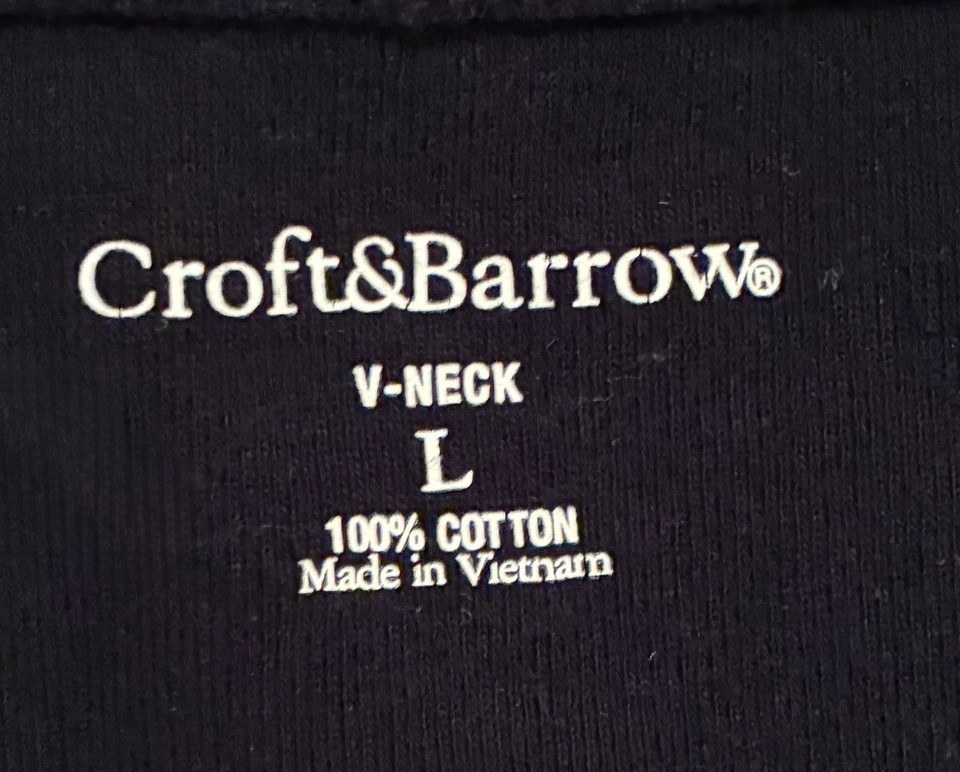 Croft Barrow Essential V-Neck Short Sleeve Tee in classic black, size Large. This comfortable and versatile t-shirt is made from 100% heavy cotton, offering breathability and softness for everyday wear. Perfect for layering or as a standalone piece, its simple V-neck design makes it a wardrobe staple. Excellent pre-owned condition, with no visible flaws. Smoke free home.