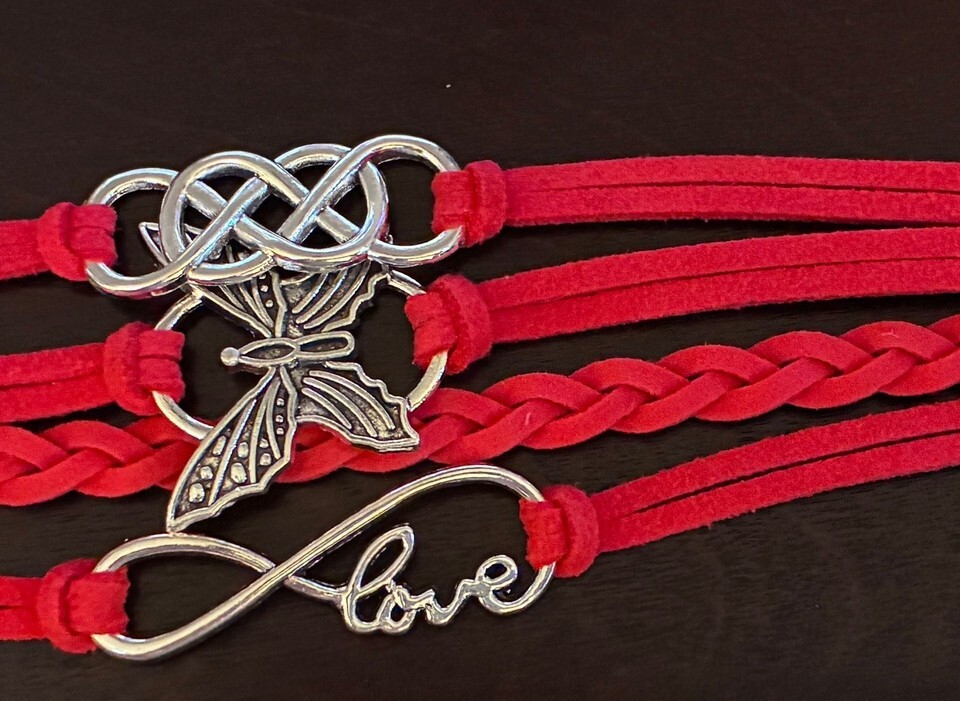 Red braided bracelet featuring a prominent infinity charm, along with a butterfly and 'love' charm. This casual accessory offers a touch of symbolic elegance for everyday wear. The durable braided design ensures comfortable wear. Perfect for gifting or adding a pop of color to your jewelry collection. 8? long with extender.