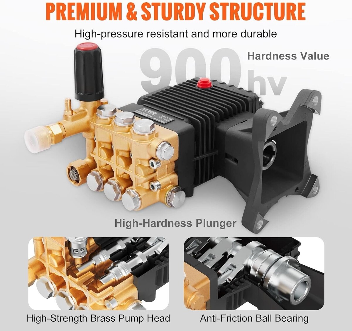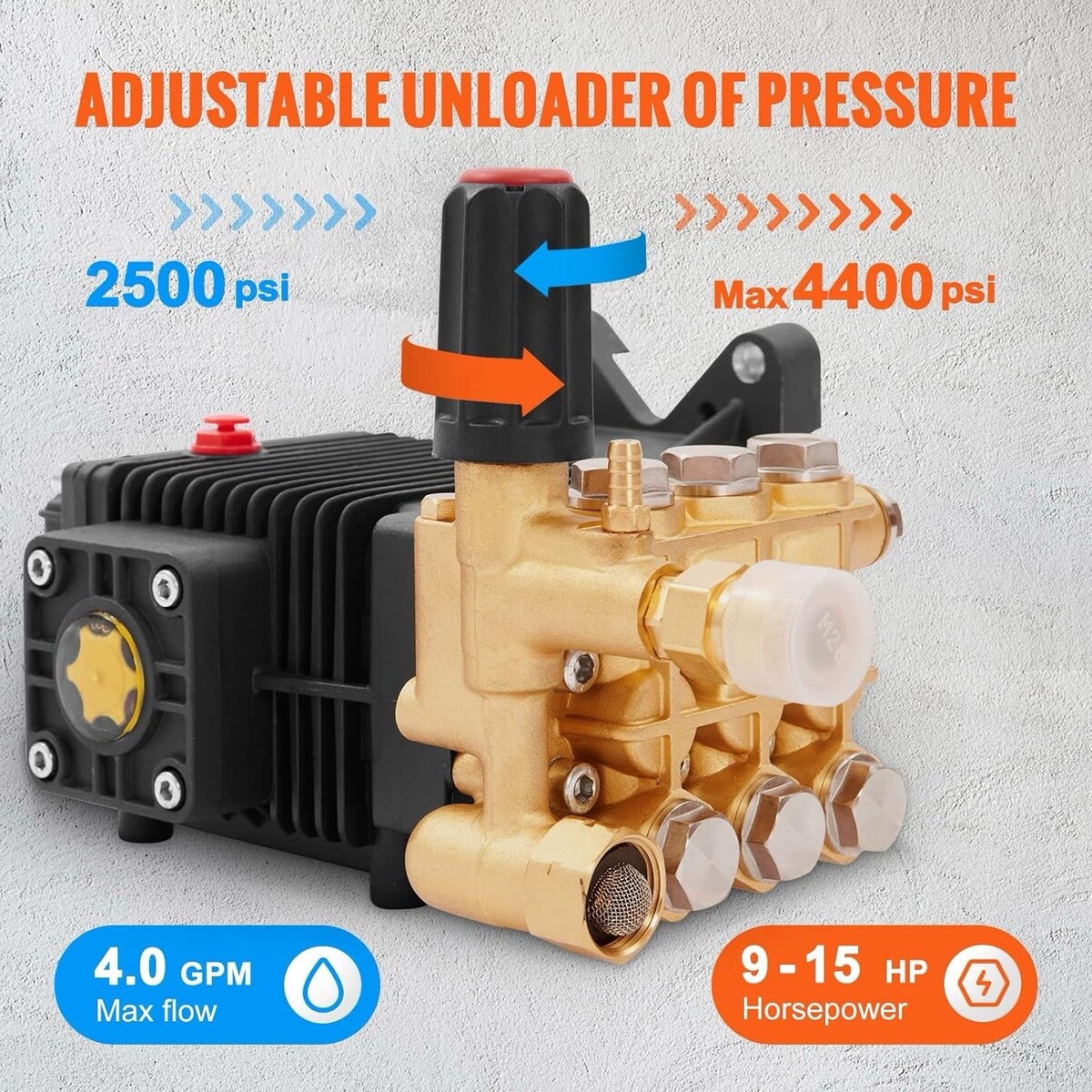 OEM-style VEVOR 4400 PSI pressure washer pump ? heavy-duty triplex plunger design with forged-brass pump head, oil sight glass, and an adjustable unloader (factory-set low for break-in). Provides powerful 4.0 GPM flow for residential or commercial cleaning jobs.